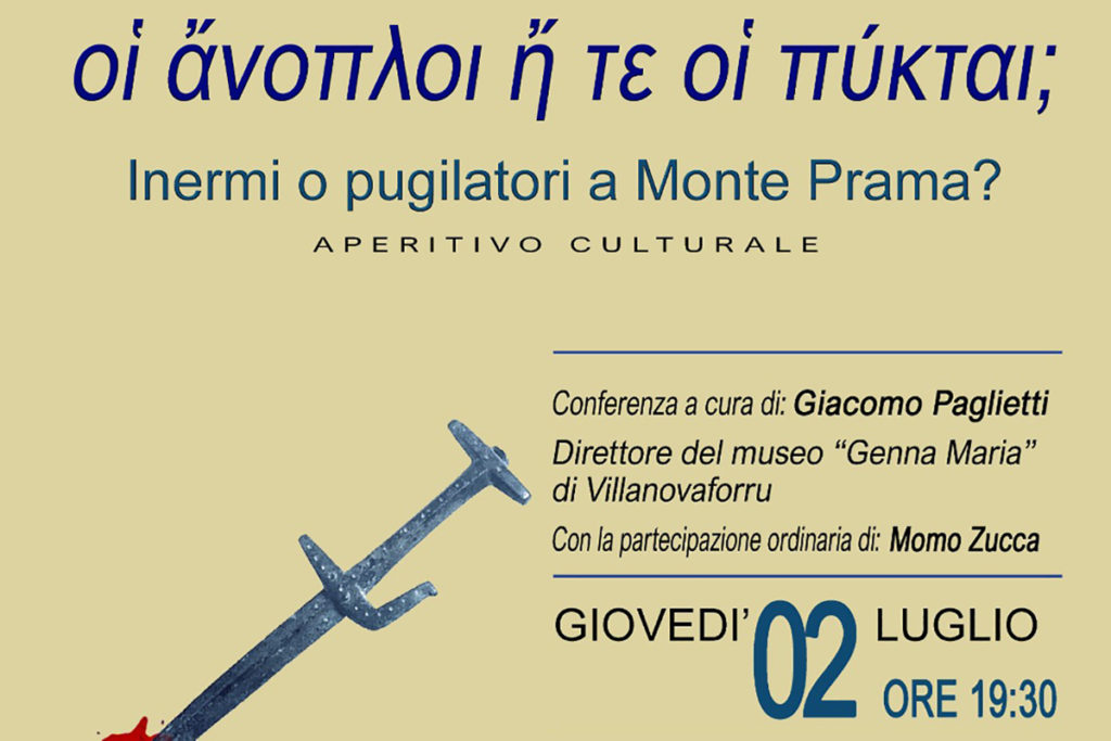 La Fondazione Oristano organizza un nuovo aperitivo culturale. Giovedì 2 luglio, alle 19:30, nel giardino dell’Antiquarium Arborense in Piazza Corrias, il direttore e curatore del museo cittadino Raimondo Zucca e Giacomo Paglietti direttore del Museo di Villanovaforru terranno una conferenza sul tema: “οἱ ἄνοπλοι ἤ τε οἱ πύκται – Inermi o pugilatori a Monte Prama?”