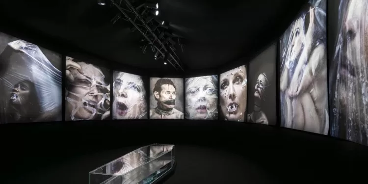 Al centro dell’installazione, una bara trasparente piena d’acqua di mare accoglie i visitatori in un ambiente immersivo. Le grandi stampe, montate su una parete nera e fissate con chiodi di ferro battuto, amplificano la tensione visiva ed emotiva dell’opera. A suggerire il silenzio degli abissi, l’artista Marina Abramović ha proposto l’uso di cuffie insonorizzanti, contribuendo all’esperienza sensoriale dell’allestimento.
