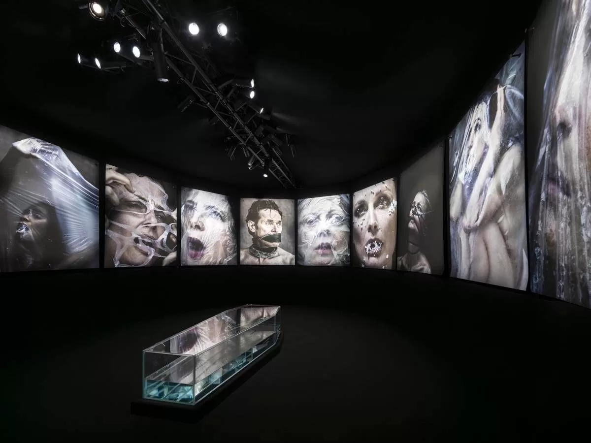 Al centro dell’installazione, una bara trasparente piena d’acqua di mare accoglie i visitatori in un ambiente immersivo. Le grandi stampe, montate su una parete nera e fissate con chiodi di ferro battuto, amplificano la tensione visiva ed emotiva dell’opera. A suggerire il silenzio degli abissi, l’artista Marina Abramović ha proposto l’uso di cuffie insonorizzanti, contribuendo all’esperienza sensoriale dell’allestimento.