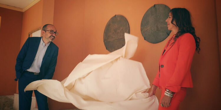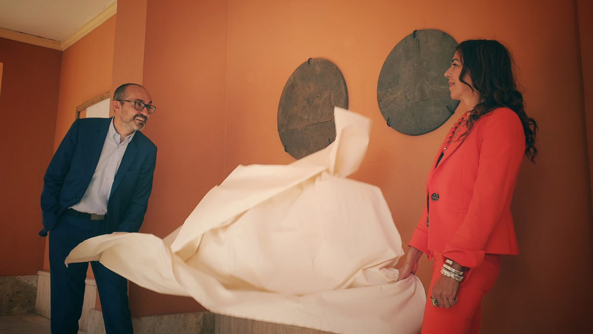 Il drappo bianco che copriva i due bassorilievi, collocati all’ingresso della Galleria, è stato strappato via dal Sindaco di Cagliari, Paolo Truzzu e dalla neo Assessora alla Cultura, Maria Dolores Picciau che hanno preso parte all’incontro con la stampa.