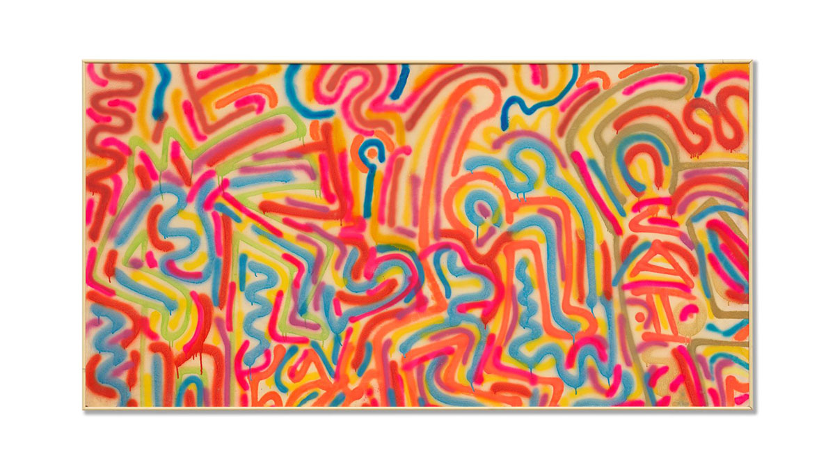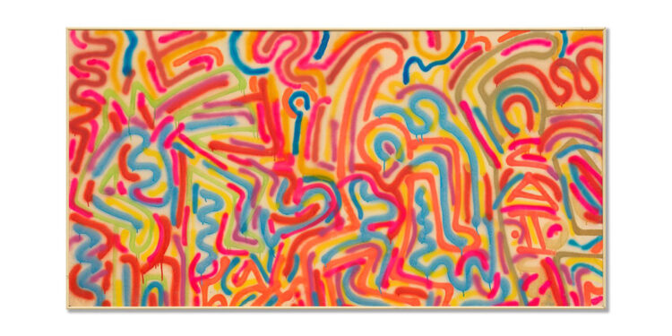 La principale novità dell’estate 2021 riservata al sofisticato pubblico di Porto Cervo è rappresentata da un’opera gigante realizzata da Keith Haring & LA II all’inizio del 1984. L’opera senza titolo (vernice spray su legno 186x98cm) si fregia della certificazione della Fondazione Keith Haring e ha una storia molto affascinante, che affonda le radici nella Milano, capitale della moda e delle nuove tendenze degli anni ‘80: Elio Fiorucci, ad inizio 1984 consegnò a Keith Haring, suo amico ed affinità elettiva, le chiavi del suo flagship di Piazza San Babila affinché l’artista lo trasformasse in un luogo unico, capace di ispirare e stupire; Haring, insieme al talento emergente LA II decorò in soli due giorni e due notti il concept store più famoso d’Italia e contribuì a rendere unica l’atmosfera del negozio di Fiorucci, dove l’arte e design si univano a collezioni di abiti, accessori, profumi e pezzi unici, proprio come accadeva nelle città più trendy del mondo come Londra e New York. Il pezzo in mostra alla Galleria Deodato Arte di Porto Cervo è un superstite di quello straordinario lavoro, un’opera realizzata in vernice fluorescente, visibile anche al buio con lampade speciali, nella quale si riconoscono alcuni tra gli elementi iconici di Haring come il cagnolino e l’omino che balla, contaminati dal segno grafico di LA II.
