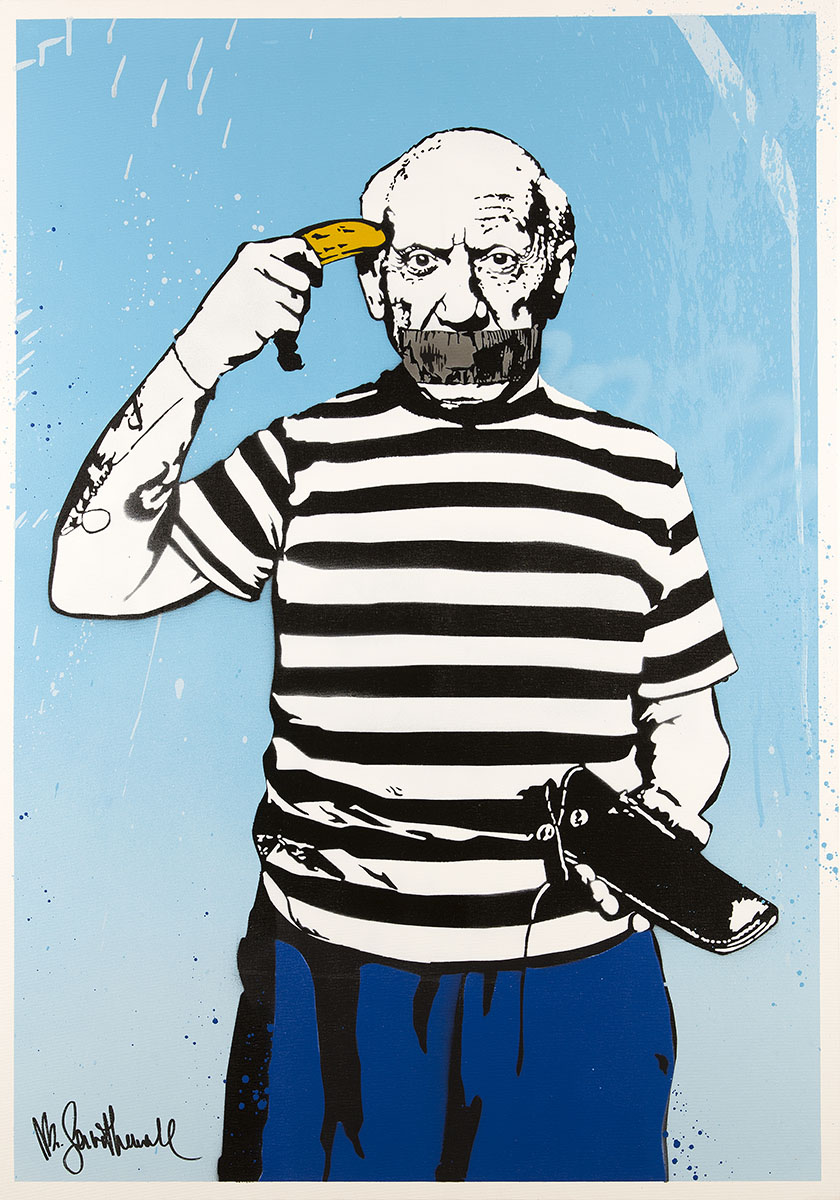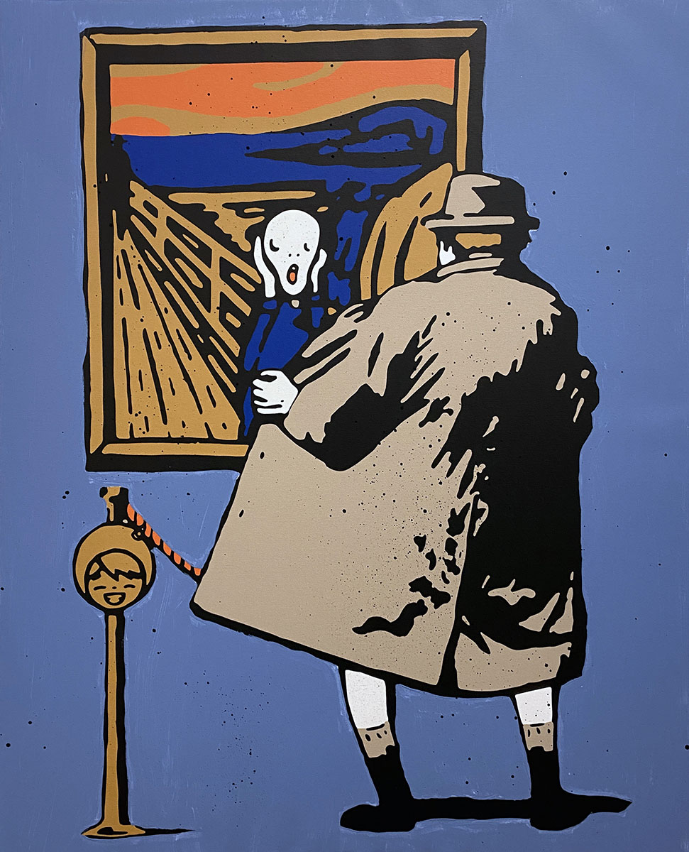 Banksy – “Queen Victoria”, 50×70 cm, serigrafia su carta, 2003 Mr. Savethewall – “L’arte contemporanea è davvero alla frutta”, 100×70 cm, tecnica mista su tela, 2021 Tvboy – “The Scream – Blue”, 65×80 cm, tecnica mista su tela Mr. Brainwash – “Juxtapose”, 127×76 cm, tecnica mista su carta fatta a mano, 2018 Romero Britto – “Children”, 99×81 cm, serigrafia digitale su tela