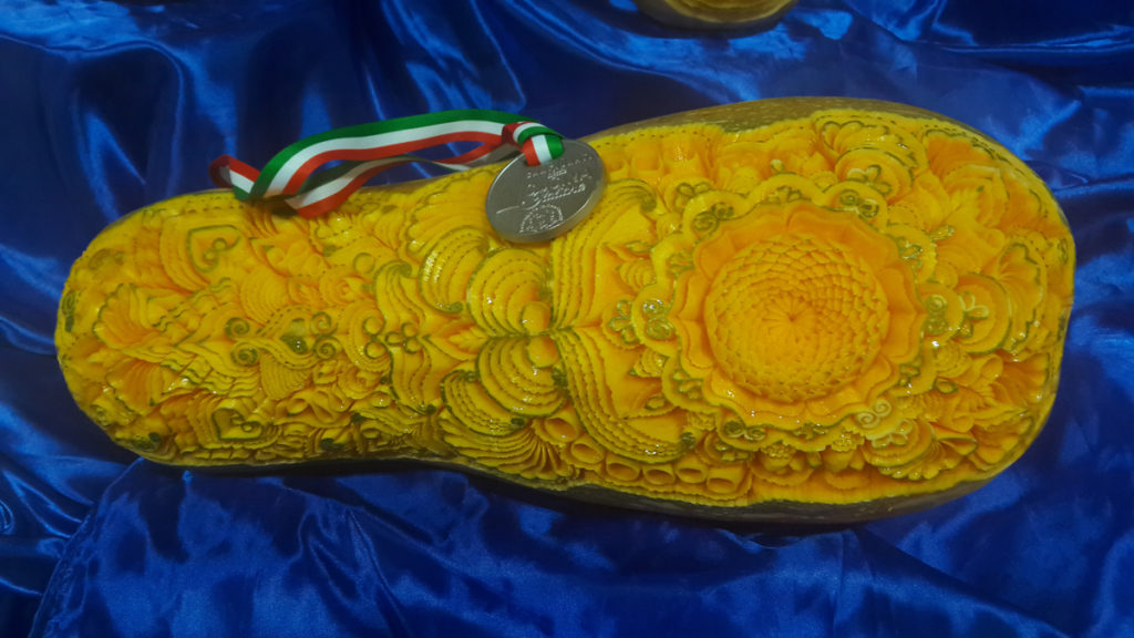 Adriano ci racconta che la sua passione per l’intaglio nasce cinque anni fa, dopo che un’amica gli ha mostrato dei link su Facebook riguardanti l’intaglio. Così, alla prima cena in famiglia, si cimenta con delle semplici opere di assemblaggio. La prima volta intaglia un melone a forma di carrozzina usando delle arance per fare le ruote. Poi con due mele, una rossa e una gialla, intaglia dei cigni. Adriano è un autodidatta, ma la sua attitudine per il disegno e il suo passato da scultore sul legno, lo hanno aiutato a trasferire le sue conoscenze e la sua manualità, nell’intaglio della frutta e della verdura.