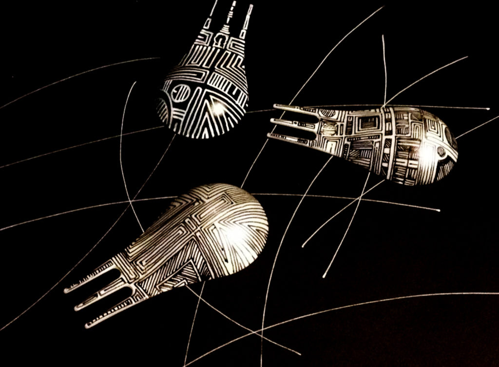 A distanza di così tanto tempo, è sorprendente quanto un così piccolo oggetto, nato per soddisfare una semplice necessità legata ai catering e agli aperitivi nei bar, generi ancora tanto interesse ed affezione. Scopro i nostri Moscardini nelle case in cui sono stato ospite, posizionati nella scatola del sale grosso o dello zucchero, un mio caro amico lo porta sempre con sé nelle sue solitarie imprese ciclistiche, è bello sapere di poterlo trovare nella collezione permanente del Moma e del Compasso d’oro, e contemporaneamente utilizzarlo ad un party per quello che oggettivamente è: una posata di servizio. Il lavoro di Genesio Pistidda genera però una nuova interpretazione del Moscardino: la sua sagoma così semplice ed iconica si amalgama in modo perfetto con le grafiche dal sapore etnico generate da Genesio. L’artista ne ridisegna la pelle: veri e propri tatuaggi imprimono un nuovo sapore all’oggetto che, perdendo ogni addentellato al mondo del disegno industriale a cui è sempre appartenuto, si rigenera nel mondo dell’arte, prestandosi al gioco dei rimandi semantici, alla libera interpretazione dell’autore e a tutto ciò che il semplice visitatore potrà cogliere dal sorprendente ed inedito incontro tra arte, grafica e design.” – Giulio Iacchetti