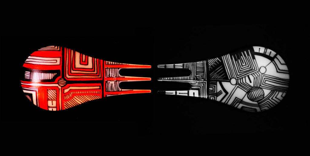 A distanza di così tanto tempo, è sorprendente quanto un così piccolo oggetto, nato per soddisfare una semplice necessità legata ai catering e agli aperitivi nei bar, generi ancora tanto interesse ed affezione. Scopro i nostri Moscardini nelle case in cui sono stato ospite, posizionati nella scatola del sale grosso o dello zucchero, un mio caro amico lo porta sempre con sé nelle sue solitarie imprese ciclistiche, è bello sapere di poterlo trovare nella collezione permanente del Moma e del Compasso d’oro, e contemporaneamente utilizzarlo ad un party per quello che oggettivamente è: una posata di servizio. Il lavoro di Genesio Pistidda genera però una nuova interpretazione del Moscardino: la sua sagoma così semplice ed iconica si amalgama in modo perfetto con le grafiche dal sapore etnico generate da Genesio. L’artista ne ridisegna la pelle: veri e propri tatuaggi imprimono un nuovo sapore all’oggetto che, perdendo ogni addentellato al mondo del disegno industriale a cui è sempre appartenuto, si rigenera nel mondo dell’arte, prestandosi al gioco dei rimandi semantici, alla libera interpretazione dell’autore e a tutto ciò che il semplice visitatore potrà cogliere dal sorprendente ed inedito incontro tra arte, grafica e design.” – Giulio Iacchetti