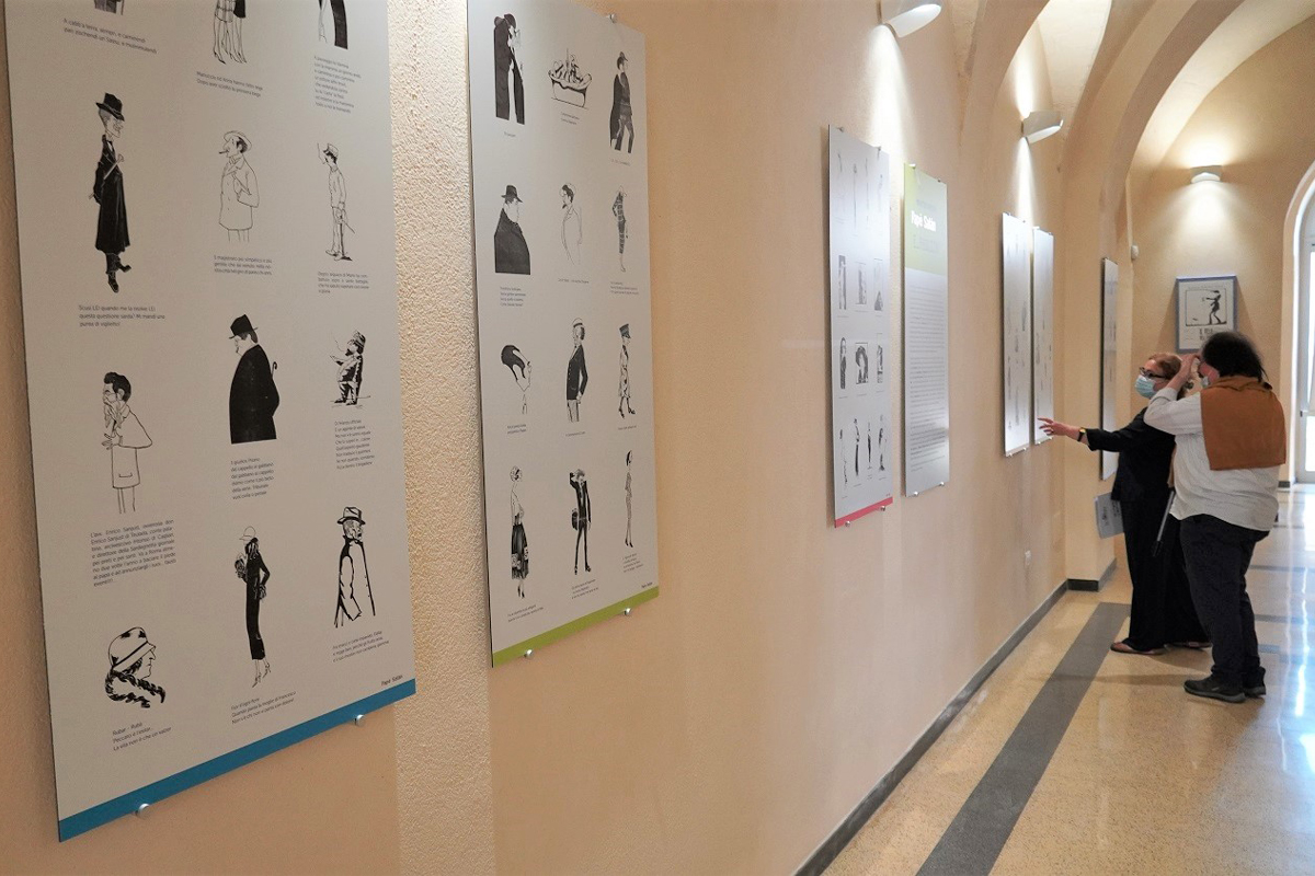 Al piano terra si dispiega un percorso che dispone creativamente, entro un caleidoscopico carosello danzante, una serie ricchissima di pupazzetti, riprodotti e accostati con garbo minimalista nella loro esplosiva e impattante verve estetica e testuale. Nelle teche figurano, quale essenziale supporto didascalico, a puntuale contrappunto, gli originali di una parte dei circa quaranta periodici al centro del progetto di ricerca iconografica.