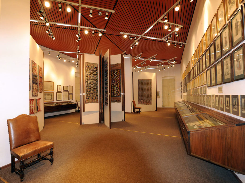 “All’interno della collezione trovano spazio anche 132 stampe e dipinti rappresentanti i costumi isolani – prosegue la curatrice – che rivestono un interesse sia etnografico che storico culturale”. L’attenzione di Piloni spazia anche per i gioielli, quasi tutti riferibili a botteghe sarde. Rosari, medaglie religiose, croci e amuleti sono la volontà del collezionista di documentare la spiritualità dei sardi. Ma sono presenti anche oggetti di uso comune come bottoni, collane e medaglie. Chiudono il catalogo i prodotti tessili. All’interno della raccolta si possono trovare copricassa, coperte e bisacce ma sono presenti anche due rari tessuti funebri, chiamati tapinos de mortu, provenienti da Orgosolo, usati per adagiare sul pavimento la salma durante la veglia funebre, i cui motivi ricordano il passaggio verso l’aldilà.