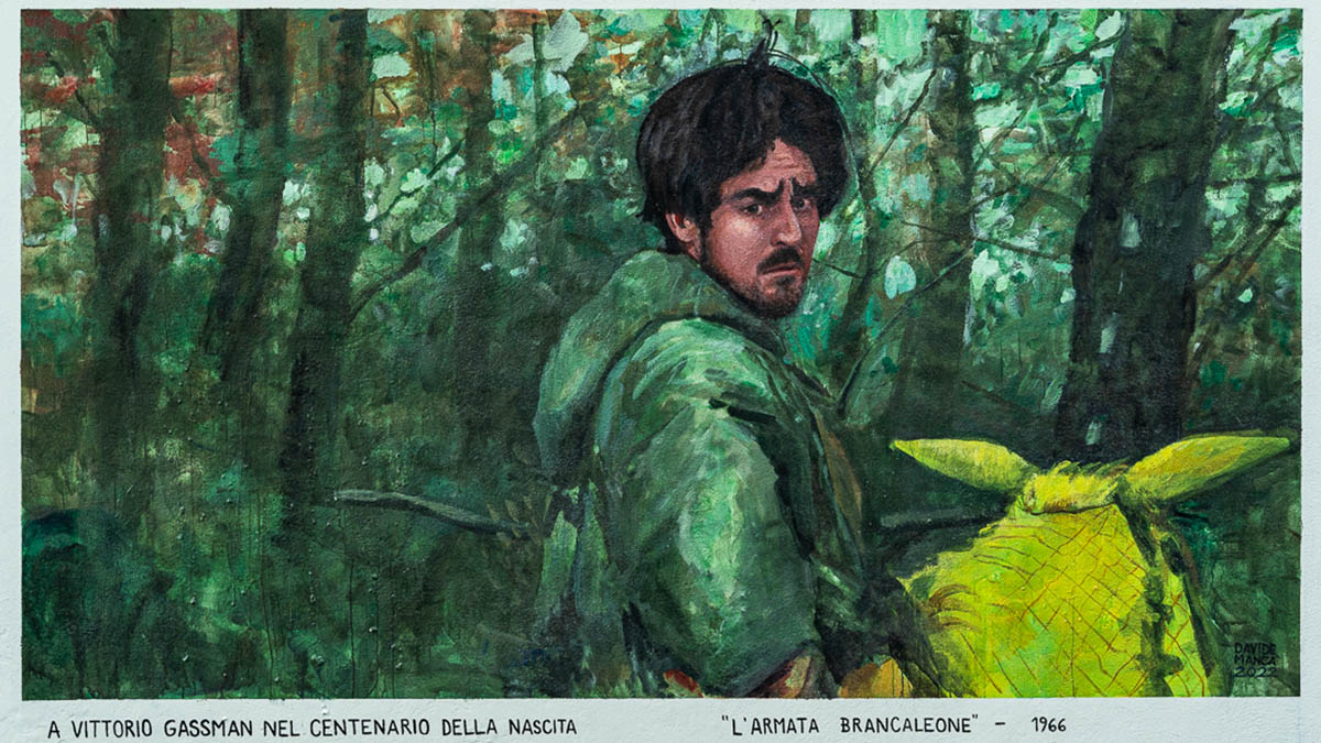 Per celebrare il grande attore l’artista Davide Manca, docente di disegno all’Accademia di Belle Arti di Sassari, ha riprodotto su una parete lungo la via principale del paese un fotogramma dal capolavoro di Mario Monicelli “L’armata Brancaleone” con protagonista Vittorio Gassman nei panni di Brancaleone da Norcia.