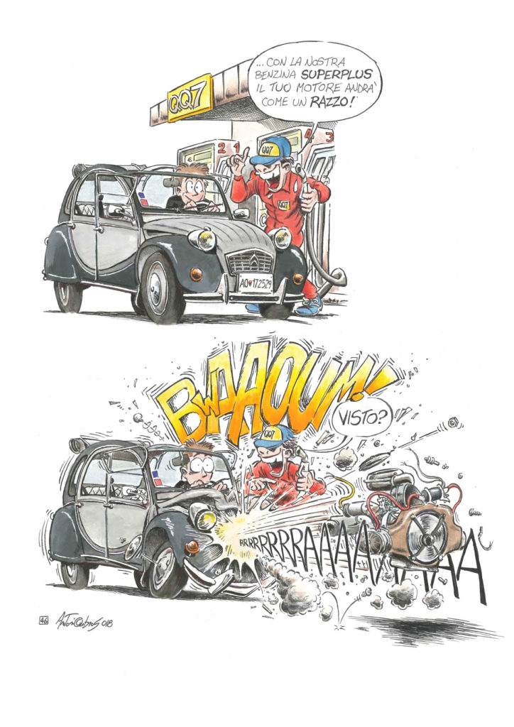 In senso più ampio, l’accusa verso la contemporaneità è un po’ il filo conduttore di molti suoi lavori, e come dice lui stesso: “credo che ogni mia opera sia impregnata delle mie nostalgie del passato e della diffidenza verso il futuro, che racconto in modo grottesco e sarcastico in modo che fra una risata e l’altra “passi” il mio messaggio pessimistico”. Ma questa non è una mancanza di slancio verso il futuro, tutt’altro, è piuttosto una malinconia per le cose autentiche, a tratti innocenti. Una visione che impregna soprattutto l’approccio alla sua seconda passione: le auto. “Oggi le macchine sono più o meno tutte minacciose aggressive ed enormi, ma al tempo (erano gli anni Ottanta) ogni auto aveva la sua personalità. Magari era brutta, pure bruttissima, ma c’era vita in loro.” Antonio si sposta con una 2CV che non sostituirebbe nemmeno se gli si polverizzasse attorno. Auto così amata che risulta presente in molti suoi disegni, in ambientazioni più o meno serie (esilaranti le vessazioni di una gang di piccioni incontinenti alla quale renderebbe volentieri pan per focaccia).