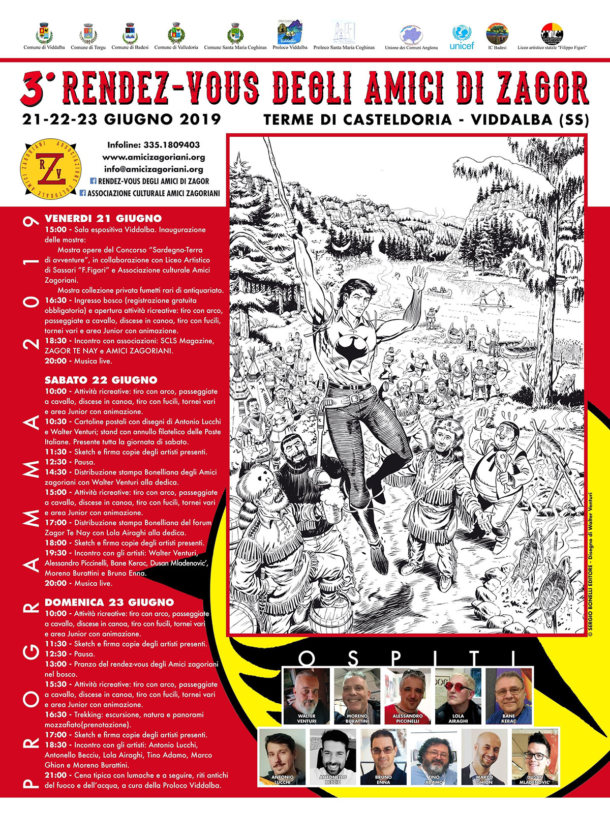 Il “Rendez-vous” proseguirà sabato e domenica, quando gli appassionati, insieme agli eventi ludici, potranno incontrare sia i responsabili di due realtà associative zagoriane come SCLS e Zagor Te Nay e – vero pezzo forte dell’edizione di quest’anno – ben 12 tra i più quotati e apprezzati autori italiani di fumetti: il già citato Walter Venturi, Moreno Burattini, curatore della serie ed erede di Guido Nolitta, Alessandro Piccinelli eccletico copertinista di Zagor con varie incursioni nel fantastico mondo di Tex, Lola Airaghi una star assoluta, il disegnatore serbo di Zagor Bane Kerac, lo studio di colorazione Mad Cow, i sassaresi Antonio Lucchi, Antonello Becciu e Bruno Enna, la colonna zagoriana Tino Adamo, il disegnatore di Tex Marco Ghion (di casa a Viddalba), e l’editore Dušan Mladenović, che pubblica Zagor in Serbia dove lo Spirito con la Scure è il fumetto più venduto.