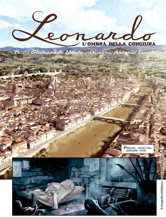Per celebrare la figura dell’eroe toscano il fumettista sassarese Antonio Lucchi, assieme allo sceneggiatore Giuseppe De Nardo, ha prestato le sue abili matite all’illustre casa Sergio Bonelli Editore (“Dylan Dog”, “Tex”, “Zagor”) per dare vita ad un fumetto storico coinvolgente e intrigante, che terrà incollati con il fiato sospeso i lettori di ogni età sino all’ultima pagina. Leonardo – l’ombra della congiura è una storia di intrighi e potere, uno spaccato dell’intricata situazione geopolitica dell’Italia quattrocentesca divisa tra signorie, corti e principati immersi in un costante conflitto che culmina con la famosa “congiura dei Pazzi” e la caduta di Giuliano de’ Medici. Lorenzo de’ Medici è ora intento a vendicare il fratello in ogni modo, scatenando una violenta repressione contro chiunque sia sospettato di aver congiurato contro la famiglia fiorentina. A farne le spese, però, è Jacopo, amico di Leonardo Da Vinci, perseguitato dalla follia del “Magnifico” e costretto ad abbandonare Firenze in favore del ducato di Milano in cerca di un porto sicuro, una serenità che però non arriverà mai, concludendosi, anni dopo, in una sanguinosa tragedia. Solamente il genio di Leonardo potrà far luce su questa intricata vicenda, comprendere i segreti nascosti dietro le mura delle corti rinascimentali e scoprire cosa c’è di vero e di falso nella vita di Jacopo, tra i navigli, le stranezze e le piazze del capoluogo lombardo.