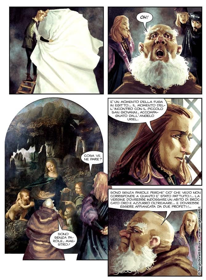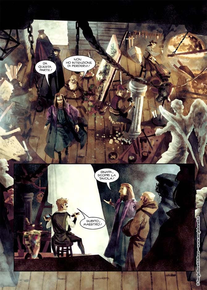 Esattamente, l’idea è proprio quella di un fumetto dipinto ed è per questo particolare stile che sono stato scelto dalla Bonelli. A livello di colori ho cercato di rispettare la palette cromatica dei quadri di Leonardo. Alcune parti della storia invece, i flashback, ho pensato di realizzarli come fossero bozzetti a sanguigna su pergamena.