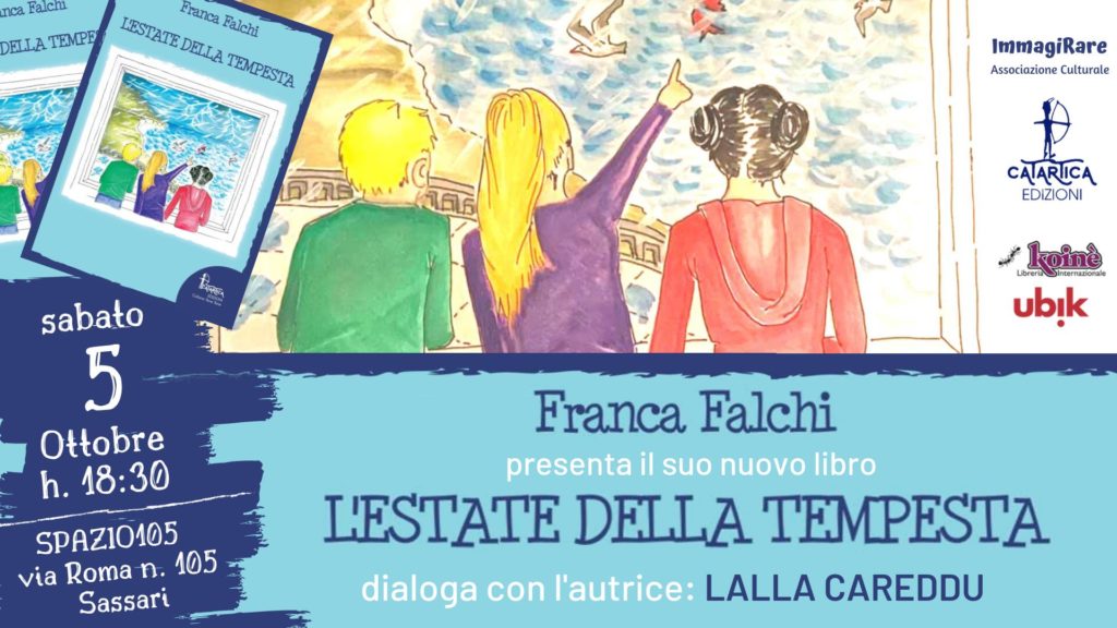 Sabato 5 ottobre, per la prima volta a Sassari, alle ore 18:30 nei locali dello Spazio 105, in via Roma 105, sarà presentato il secondo romanzo dell’autrice sassarese Franca Falchi, “L’estate della tempesta”, edito da Catartica Edizioni nella collana dedicata alla narrativa per ragazzi “Tene Tene”. L’iniziativa è organizzata in collaborazione con la libreria Koinè Ubik Internazionale. Dialogherà con l’autrice Lalla Careddu.