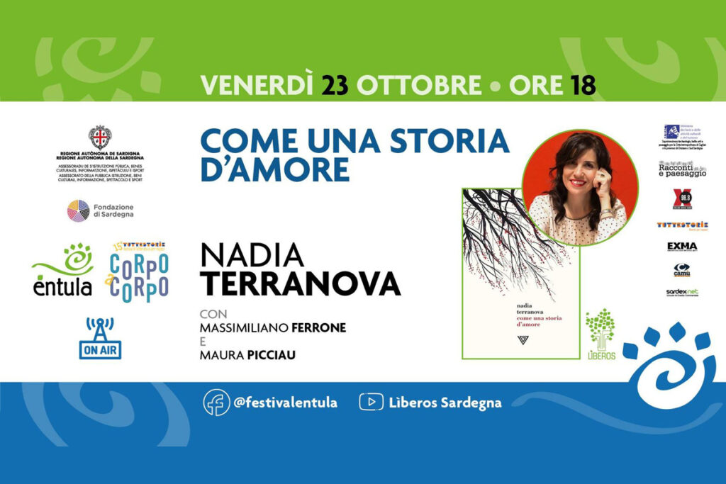 A causa di difficoltà legate al Covid-19 l’incontro con la scrittrice messinese Nadia Terranova del 23 ottobre a Cagliari è stato spostato online sul profilo Facebook del Festival Éntula e sul canale YouTube Lìberos Sardegna. Orario anticipato alle ore 18. L’appuntamento organizzato insieme a Tuttestorie è incentrato sulla presentazione del libro “Come una storia d’amore” (Giulio Perrone editore). Nadia Terranova ne discuterà con Massimiliano Ferrone e Maura Picciau.