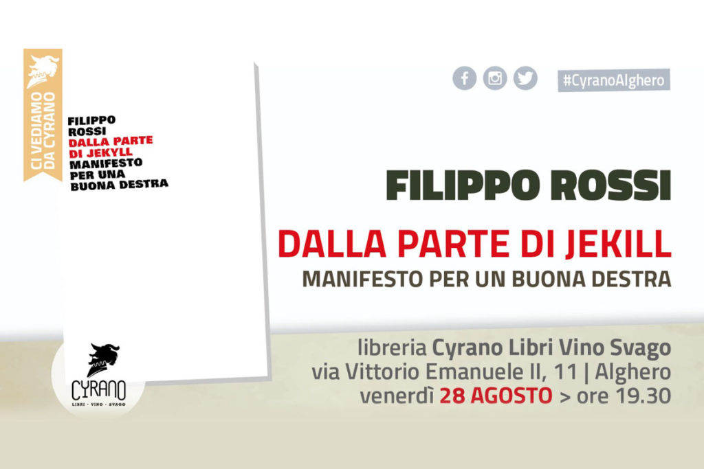 Venerdì 28 agosto alle 19:30 nello spazio all’aperto della libreria Cyrano, ad Alghero in via V. Emanuele, 11, si terrà la presentazione del volume di Filippo Rossi, “Dalla parte di Jekyll. Manifesto per una buona destra”, Marsilio Editori. Per assistere alla presentazione è consigliabile prenotarsi.