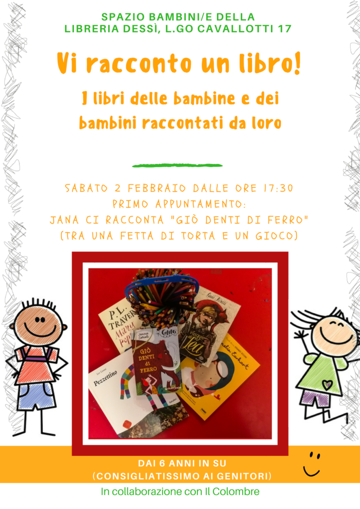 Si comincia Sabato 2 Febbraio, alle ore 17:30 nello spazio bambini/e della Libreria Dessì in l.go Cavallotti 17, con Jana di 8 anni che ci racconta Giò denti di ferro scritto da Janna Carioli.