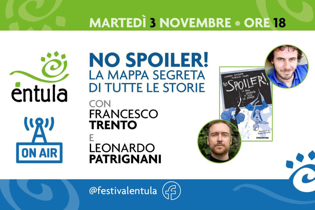 Da Toy Story agli Avengers, da Harry Potter all’epica: come riconoscere i personaggi e le strutture comuni a ogni storia! Lo spiegano Francesco Trento e Leonardo Patrignani che hanno scritto a quattro mani “No spoiler – La mappa segreta di tutte le storie” (De Agostini, 2020). Viste le nuove restrizioni l’incontro sarà trasmesso in streaming martedì 3 novembre dalle ore 18 alle 19 sulla pagina Facebook del Festival Éntula.