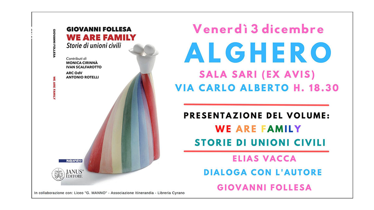 Venerdì 3 dicembre 2021 il giornalista Giovanni Follesa sarà ad Alghero per presentare, accompagnato da Elias Vacca, il suo nuovo libro “We are family. Storie di unioni civili” appena pubblicato da Janus editore. L’appuntamento è per le 18:30 nella sala Sari (Ex Avis) in Via Vittorio Emanuele. L’evento è organizzato in collaborazione con il Liceo “G. Manno”, l’Associazione Itinerandia e la Libreria Cyrano.
