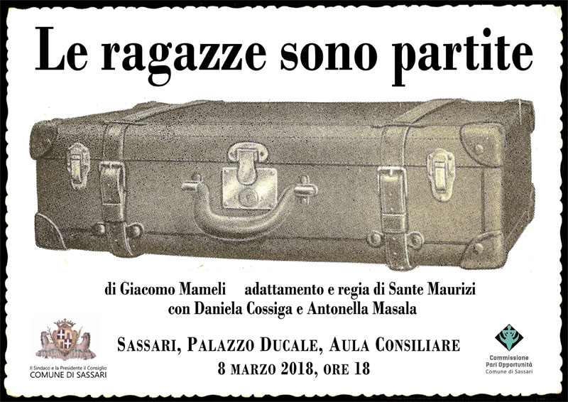 In occasione della Festa della donna il Comune di Sassari ospita a Palazzo Ducale, nella Sala del Consiglio Comunale, la piéce, promossa dalla Commissione Pari Opportunità. Lo spettacolo andrà in scena alle ore 18 dell’8 marzo, in conclusione dei lavori del Consiglio.
