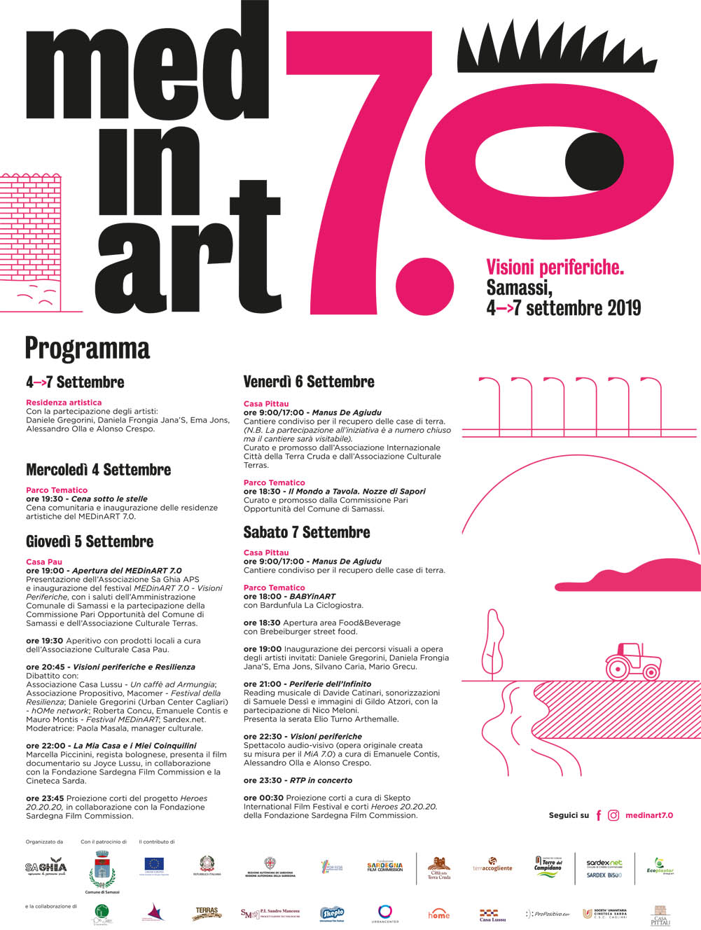 La settima edizione did MEDinART avrà inizio ufficialmente mercoledì 4 settembre alle 19.30 con la Cena (comunitaria) sotto le stelle, presso il Parco tematico di Samassi e con l’inaugurazione delle residenze artistiche che ospiteranno gli artisti Daniele Gregorini, Daniela Frongia, Ema Jons, Alessandro Olla e Alonso Crespo: un’importante occasione che lascerà al paese una traccia indelebile della loro presenza.