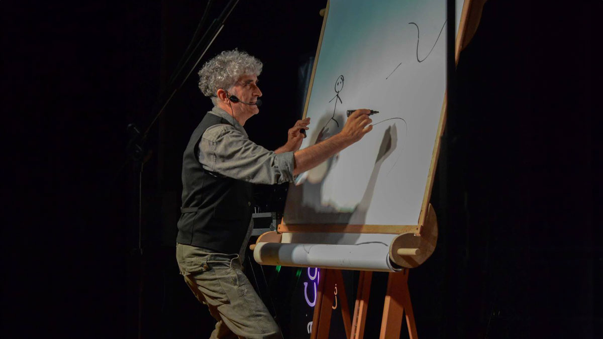Attraverso vignette che parlano di sentimenti e di sensazioni, l’artista interagisce con i partecipanti in un crescendo di emozioni che arriva a trasformare qualsiasi segno in un disegno, a tempo di musica e alternando momenti poetici a disegni umoristici.