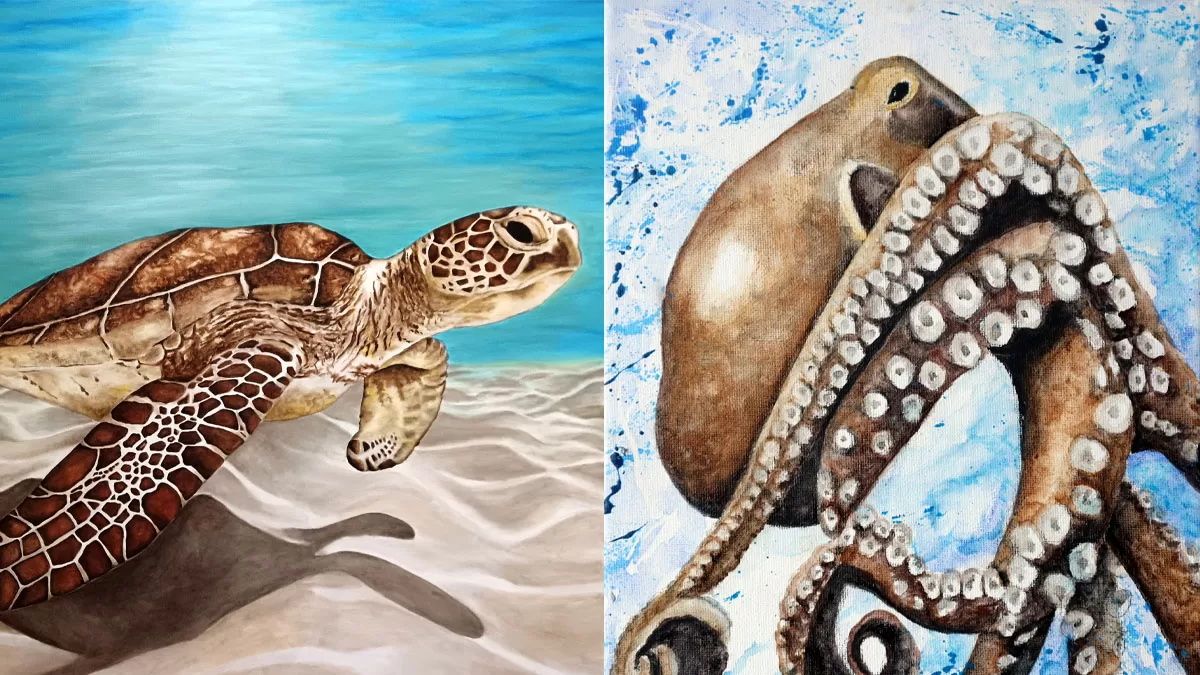 Due opere di Tiziana Sanna: Caretta Caretta e polpo