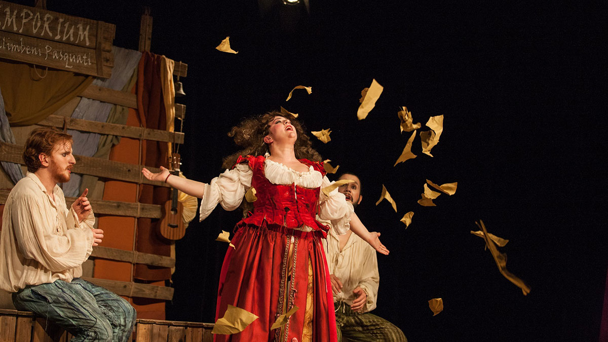 “Romeo e Giulietta – L’amore è saltimbanco” – con scenografia di Alberto Nonnato, costumi di Antonia Munaretti, maschere di Roberto Maria Macchi, duelli di Giorgio Sgaravatto e consulenza musicale di Veronica Canale – è un raffinato e moderno divertissement, da un’idea di Marco Zoppello, in cui il capolavoro del Bardo inglese «prende forma e si deforma nel mescolarsi di trame, di dialetti, canti, improvvisazioni, suoni, duelli e pantomime». In un’ipotetica sera di Carnevale nella città lagunare, nell’anno 1574 (quando in verità il dramma shakespeariano non esisteva ancora, o forse era in nuce nella testa del suo autore, se come risulta la prima stesura risalirebbe a vent’anni dopo…) tra artisti si cimentano con una trama immortale, per allestire in fretta e non senza ansie e timori uno spettacolo in onore di Enrico III di Valois, futuro re di Francia, che sulla strada per Parigi dove avverrà l’incoronazione, trascorrerà la notte nella Serenissima. Tra le calli e le fondamenta corre la voce di una visita del principe e il Doge per accogliere degnamente un ospite di tanto riguardo decide di organizzare un intrattenimento, dove non può mancare il teatro e per l’occasione la scelta cade sulla favola dei due innamorati di Verona.
