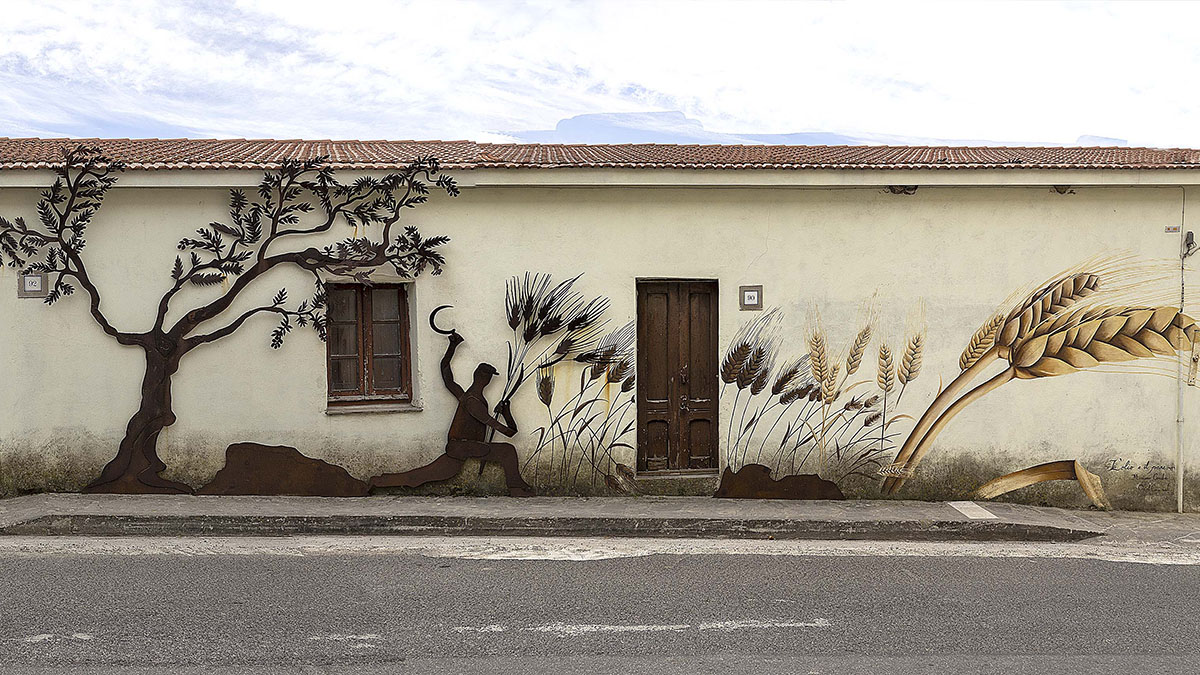 Si va dall’opera polimaterica “L’olio e il pane” realizzata nel 2014 da Oriol Caminal Martinez e Mariano Corda, in cui immagine dipinta e installazione in ferro raccontano degli oliveti e dei campi di grano da secoli perno dell’economia locale, al progetto di Street art “Codice colore 8015” curato da Manu Invisible e sviluppato in cinque interventi realizzati lo scorso febbraio lungo le vie del centro abitato. Incentrate sugli elementi identitari della comunità e legate tra loro dalle cromie che richiamano i colori del territorio, le opere portano la firma di Davide Medda, Mavz, Lorenzo Murgia, Davide Careddu e lo stesso Manu Invisible.