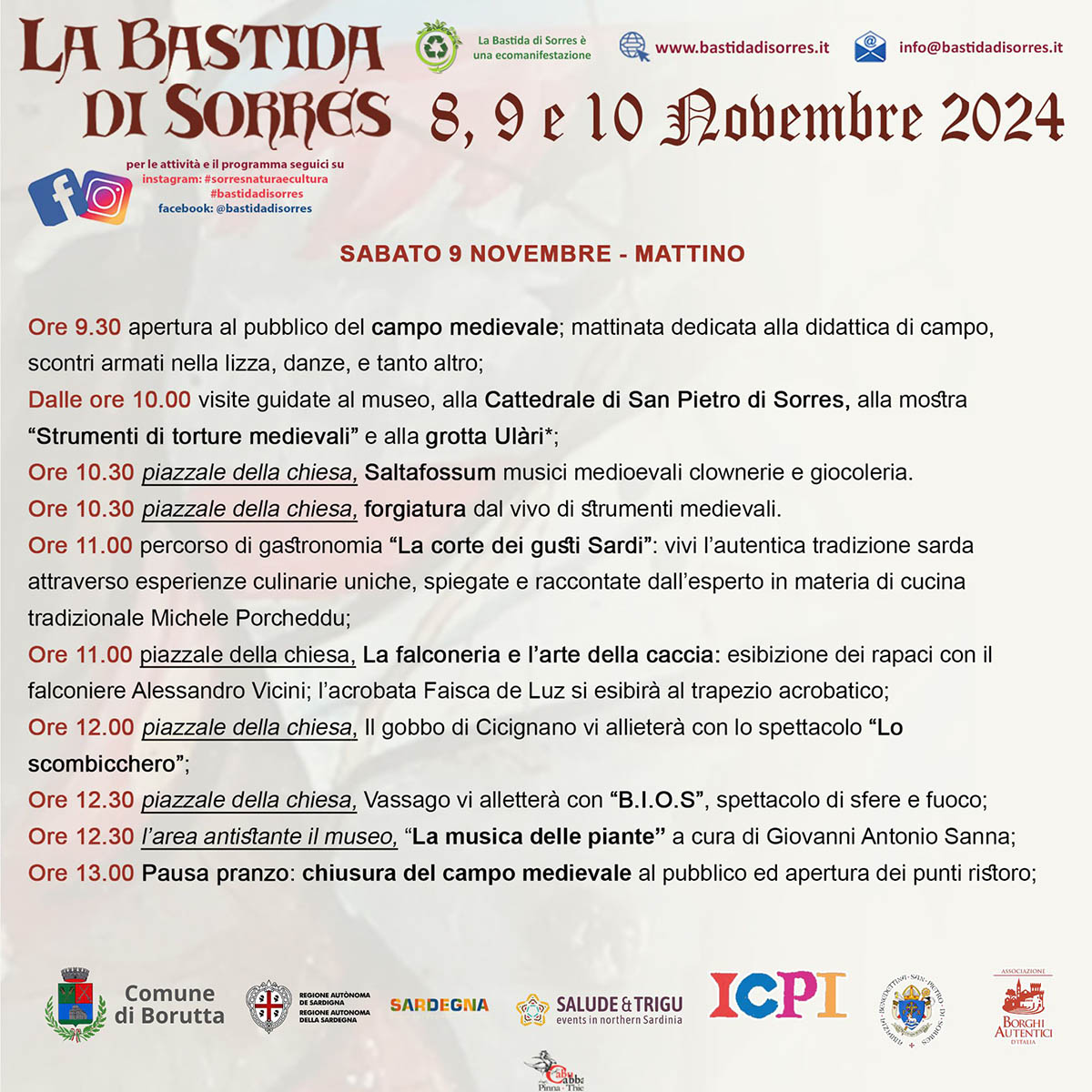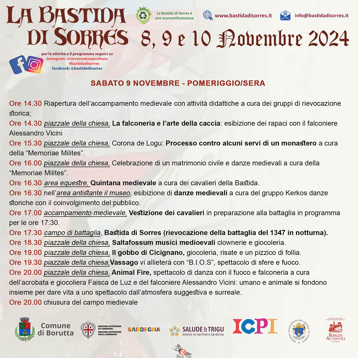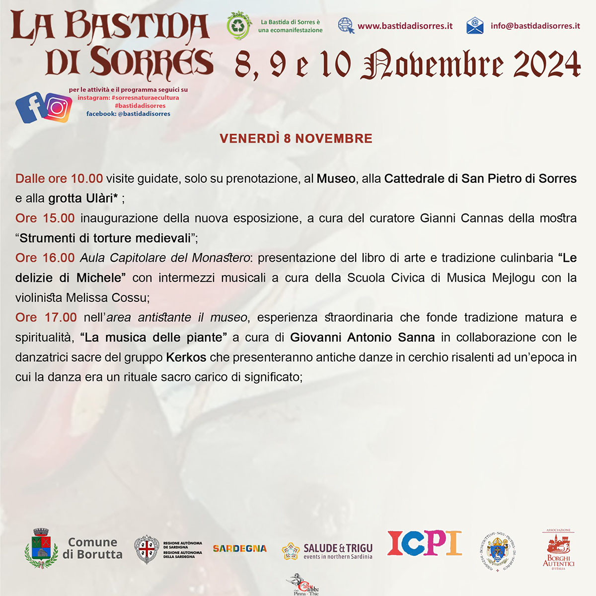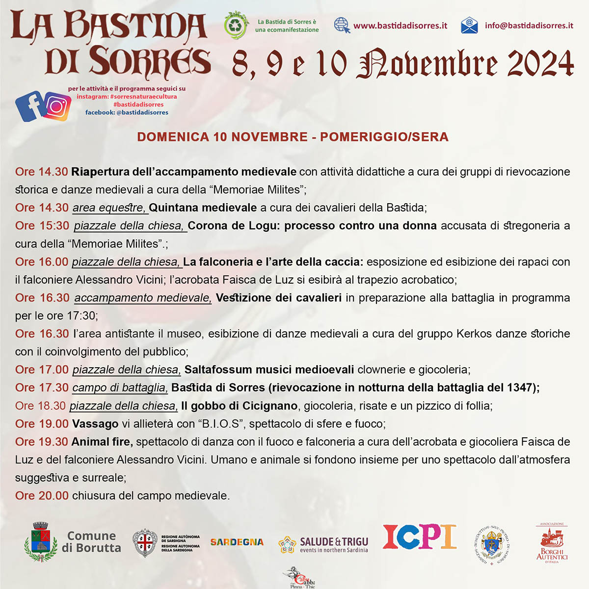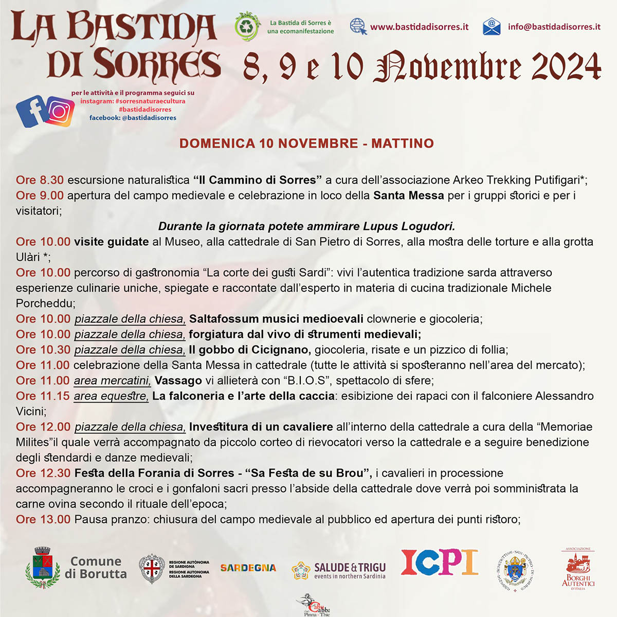 Domenica 10 novembre, la Bastida di Sorres ospiterà anche la Festa della Forania di Sorres, “Sa Festa de su Brou”. Cavalieri e figuranti in abiti sacri sfileranno in processione, accompagnando croci e gonfaloni verso l’abside della cattedrale, dove verrà distribuita carne ovina in un rituale che richiama l’antica usanza del vescovo di Sorres di offrire il brodo agli abitanti. Questo rito, meticolosamente ricostruito, rappresenta il legame tra religione, tradizione e solidarietà.