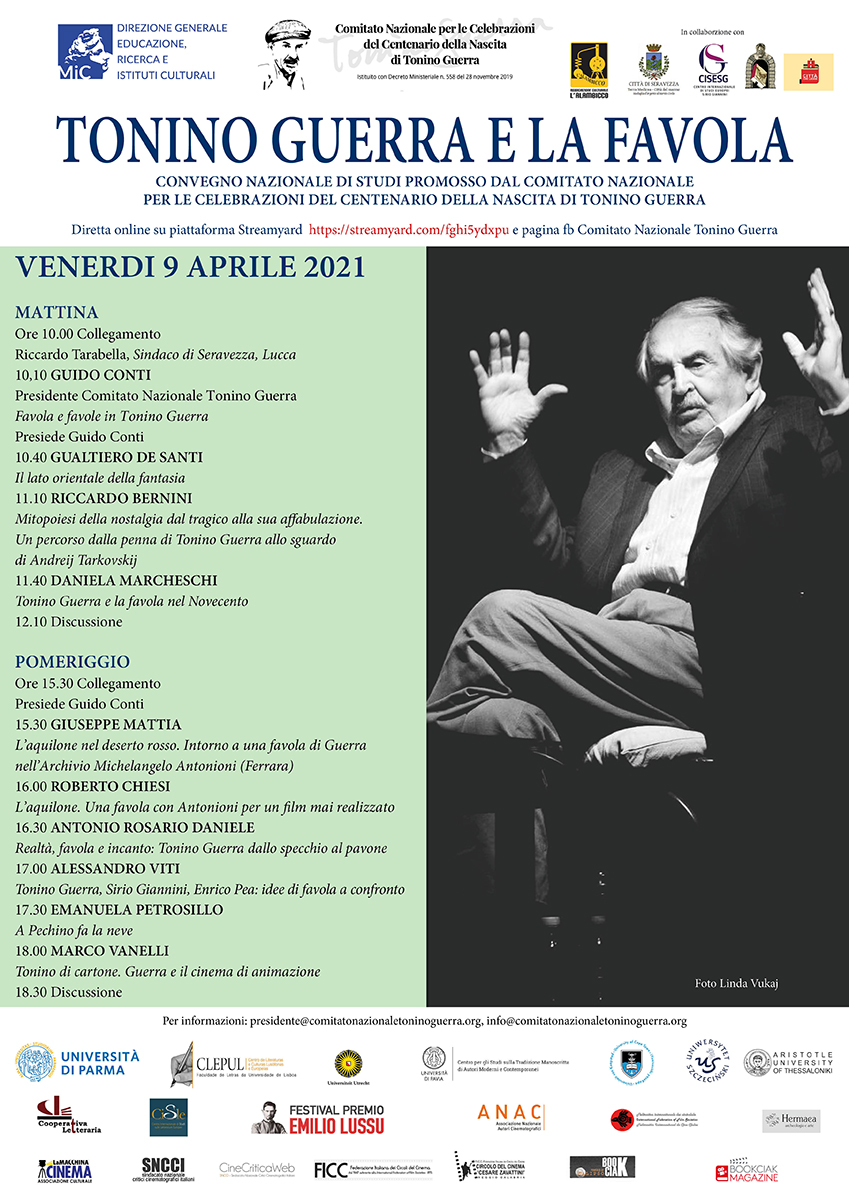 Domani, venerdì 9 aprile, a partire dalle 10:00 del mattino, in diretta streaming su piattaforma Streamyard e sulla pagina facebook “Comitato Nazionale Tonino Guerra” si terrà “Tonino Guerra e la favola”, meeting imperdibile inserito negli eventi del Centenario della nascita dello scrittore romagnolo.
