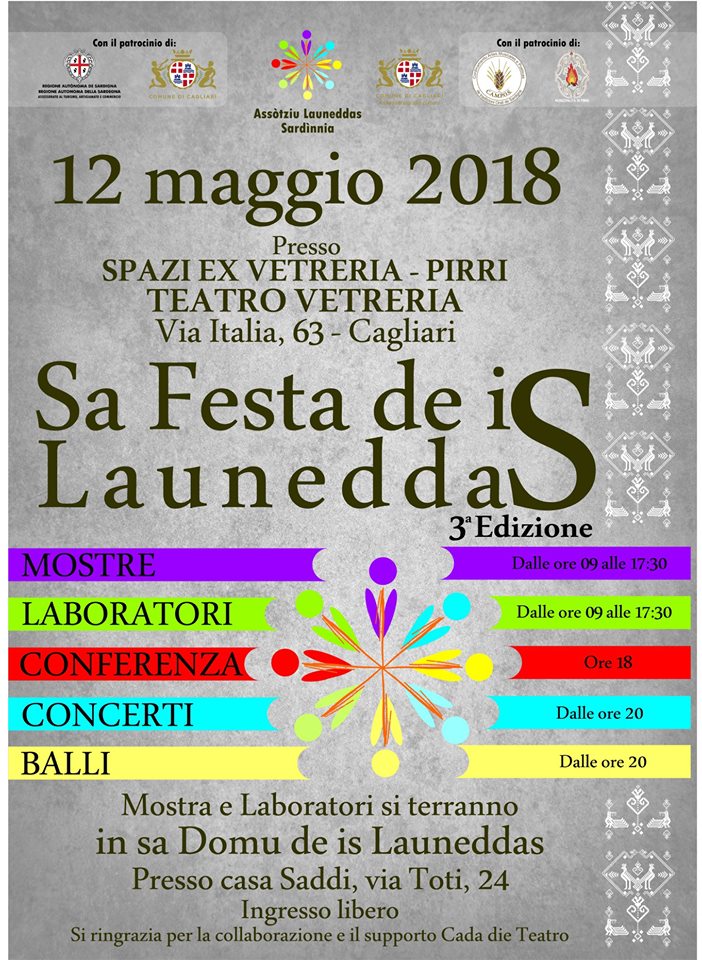Il 12 maggio 2018 si terrà presso l’Ex Vetreria di Pirri “Sa festa de is launeddas”, organizzata da Assòtziu Launeddas Sardìnnia, che in seguito al successo consolidato nelle due precedenti edizioni rinnova l’appuntamento per tutti gli appassionati dell’antico strumento millenario.