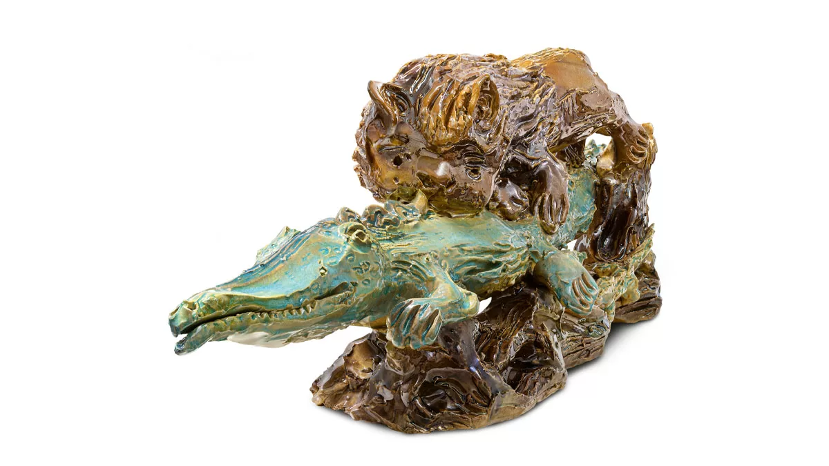 Salvatore Fancello, Leone e coccodrillo, 1937-38, terracotta smaltata decorata in policromia riflessata, 48 x 12 x 14 cm. Eredi Architetto Giancarlo Palanti, Milano