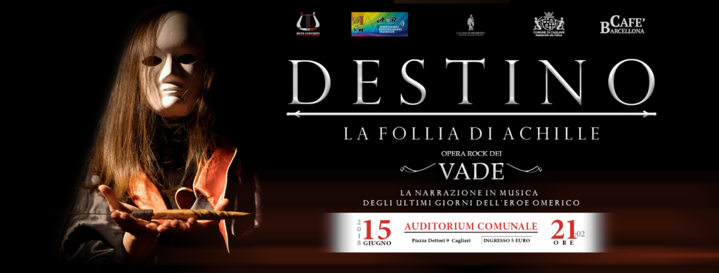 Venerdì 15 giugno alle ore 21, nell’Auditorium comunale di Cagliari in piazza Dettori 8, andrà in scena “Destino, la Follia di Achille” opera rock del complesso musicale dei VADE dedicata all’eroe omerico Achille. L’opera, reinterpretando alcuni frammenti meno conosciuti della poesia omerica, racconta gli avvenimenti della vita di Achille successivi a quelli narrati nell’Iliade.