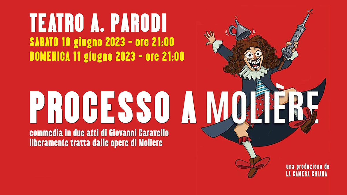 Sabato 10 e domenica 11 giugno alle ore 21:00 si conclude la rassegna Primavera Teatro 2023 organizzata dall’associazione La Camera Chiara al Teatro Andrea Parodi. In scena lo spettacolo “Processo a Molière” una commedia de La camera chiara scritta da Giovanni Caravello e liberamente ispirata alle opere di Molière