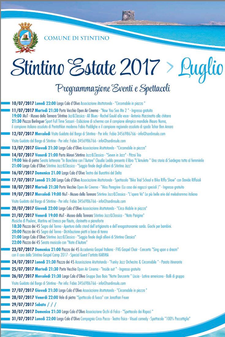 È pronto il calendario degli appuntamenti del mese di luglio e tra teatro, intrattenimento per i bambini, sport, cinema, rassegne gastronomiche, eventi musicali, incontri al museo non mancheranno le attrattive per stintinesi e turisti. Il cartellone predisposto dall’assessorato Spettacoli e Cultura del Comune costiero sarà in grado di soddisfare le aspettative di giovani e famiglie.