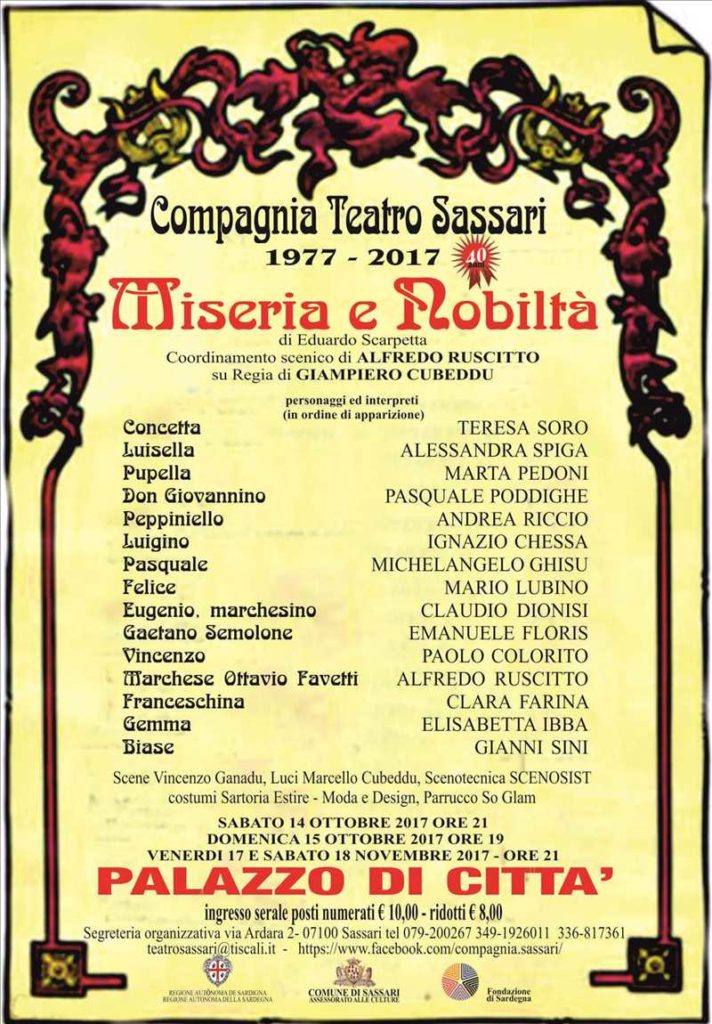 Era il 14 ottobre 1977 quando la Compagnia Teatro Sassari debuttava con “Tziu Luiginu e li tempi nobi e Paj vinzì vi bò la sthumbadda”, due atti unici di Giovanni Enna. Quarant’anni più tardi festeggia un importante anniversario con “Miseria e Nobiltà” di Eduardo Scarpetta. Una scelta che rispecchia la storia del gruppo di teatranti, che ha portato in scena classici del teatro sassarese e riletto altrettanti classici della tradizione italiana.