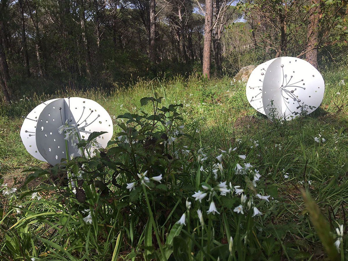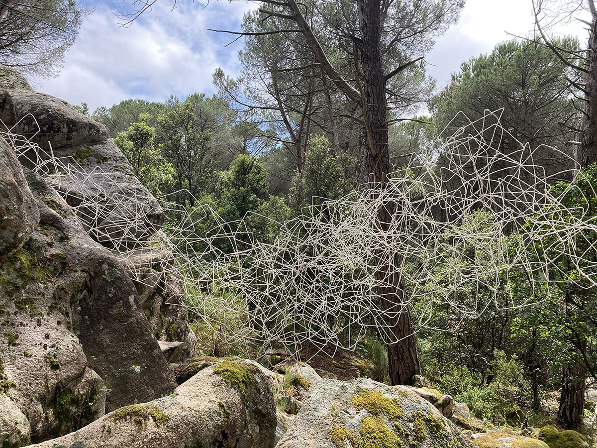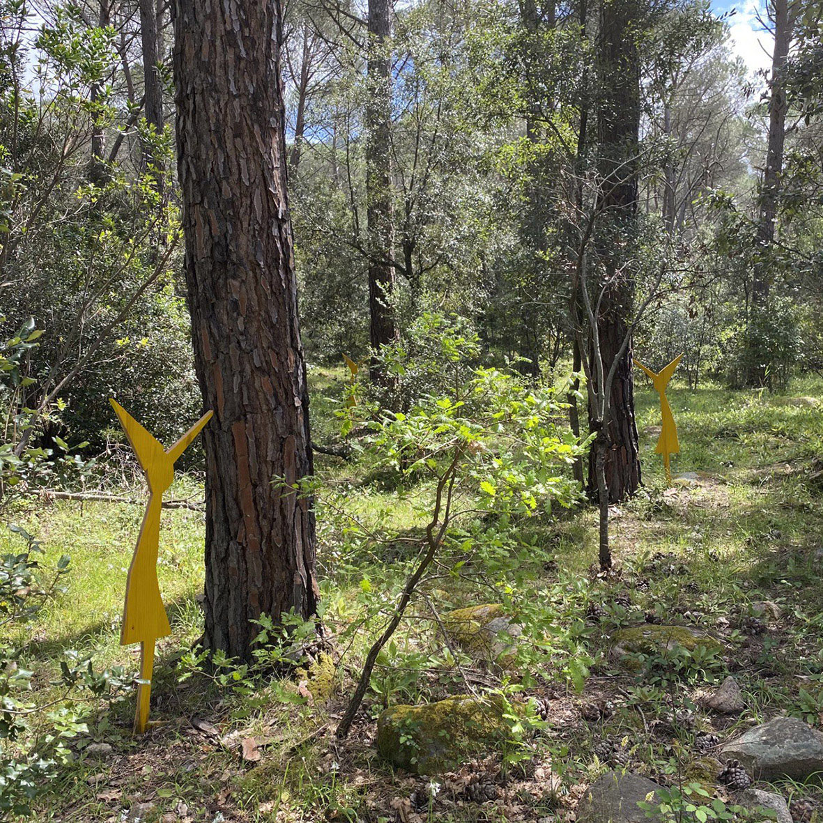 Diversi gli approcci e i media utilizzati dagli artisti invitati dal curatore Giannella Demuro a confrontarsi con la natura incontaminata del Limbara: corde di juta colorate con i colori del mirto e del corbezzolo tese attorno a pini alieni creano monumentali arbremagique con i quali Pietruccia Bassu diffonde i profumi della macchia mediterranea; torrette di avvistamento minimali nascoste tra gli alberi – le Limbara Observatory Towers di Paolo Carta – per osservare il mondo naturale e , di riflesso, anche se stessi; uno spazio naturale modificato dall’intervento umano ritrova l’armonia con l’intervento minimale di Paola Dessy che ricompone volumi e superfici utilizzando levigate inserzioni metalliche; gli Innesti modulari di Daniela Frongia compongono una struttura architettonica dal movimento fluido e morbido sospesa nel vuoto tra graniti e pini svettanti che modifica la percezione del paesaggio e dello spazio circostante; le sedute nomadi Senza titolo (jeans) di Giuseppe Loi, gusci morbidi e accoglienti, sono tracce di vita individuali tra le creste del granito e le piante infestanti di un luogo denso di memorie passate e in attesa di azioni future; otto piccole figure gialle disseminate in ordine sparso nel bosco ma visibili le une alle altre, costituiscono l’opera ironica di Gianni Nieddu: i Pinocchio picchiosono piantati sul terreno, il naso verso l’alto a esplorare il tronco, forse alla ricerca delle proprie origini; Sabrina Oppo ha scelto una piccola radura intima e nascosta per accogliere il suo labirinto personale ordito di fili di metallo, LASCIAR ANDARE, dove trattiene intime e nere emozioni che la forza catartica della natura trasforma in un volo lieve di libertà. É, invece, una vera prigione la gabbia che Bruno Petretto ha costruito attorno ad un monumentale masso di granito, e la Pietra imprigionata è un monito struggente rivolto ad un’umanità troppo spesso incurante della natura che la ospita; anche Josephine Sassu con Non ho Temposi confronta con la natura litica del Limbara, ma dai massi di granito libera con un segno lieve e infantile gli animali fantastici che popolano il suo mondo immaginario. Alla macchia mediterranea si rivolge anche lo sguardo di Monica Solinas con Disseminazioni II, Myrtus che ricrea in grandi forme di metallo, i delicati fiori del mirto quasi un monumento alla fragile bellezza della nostra terra.