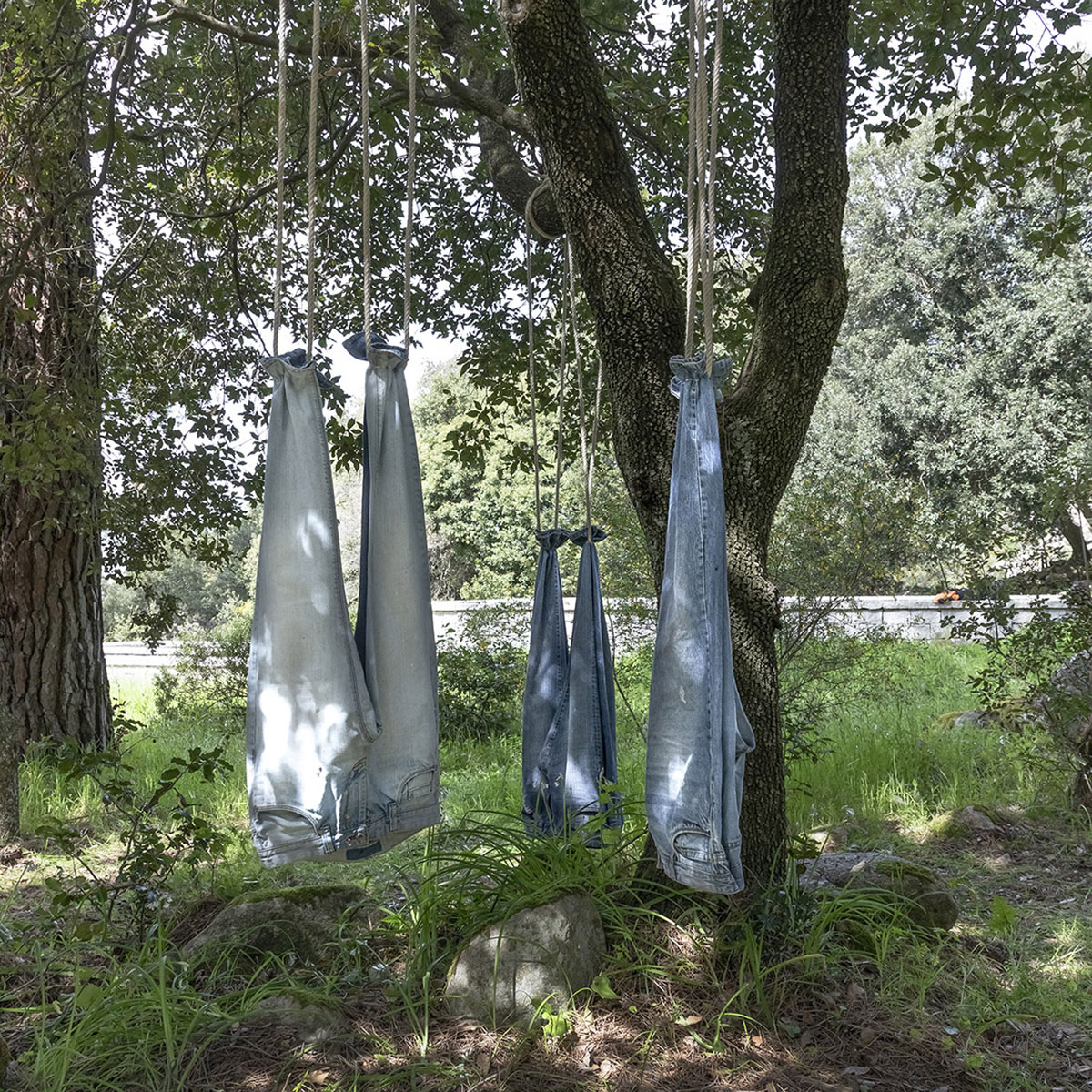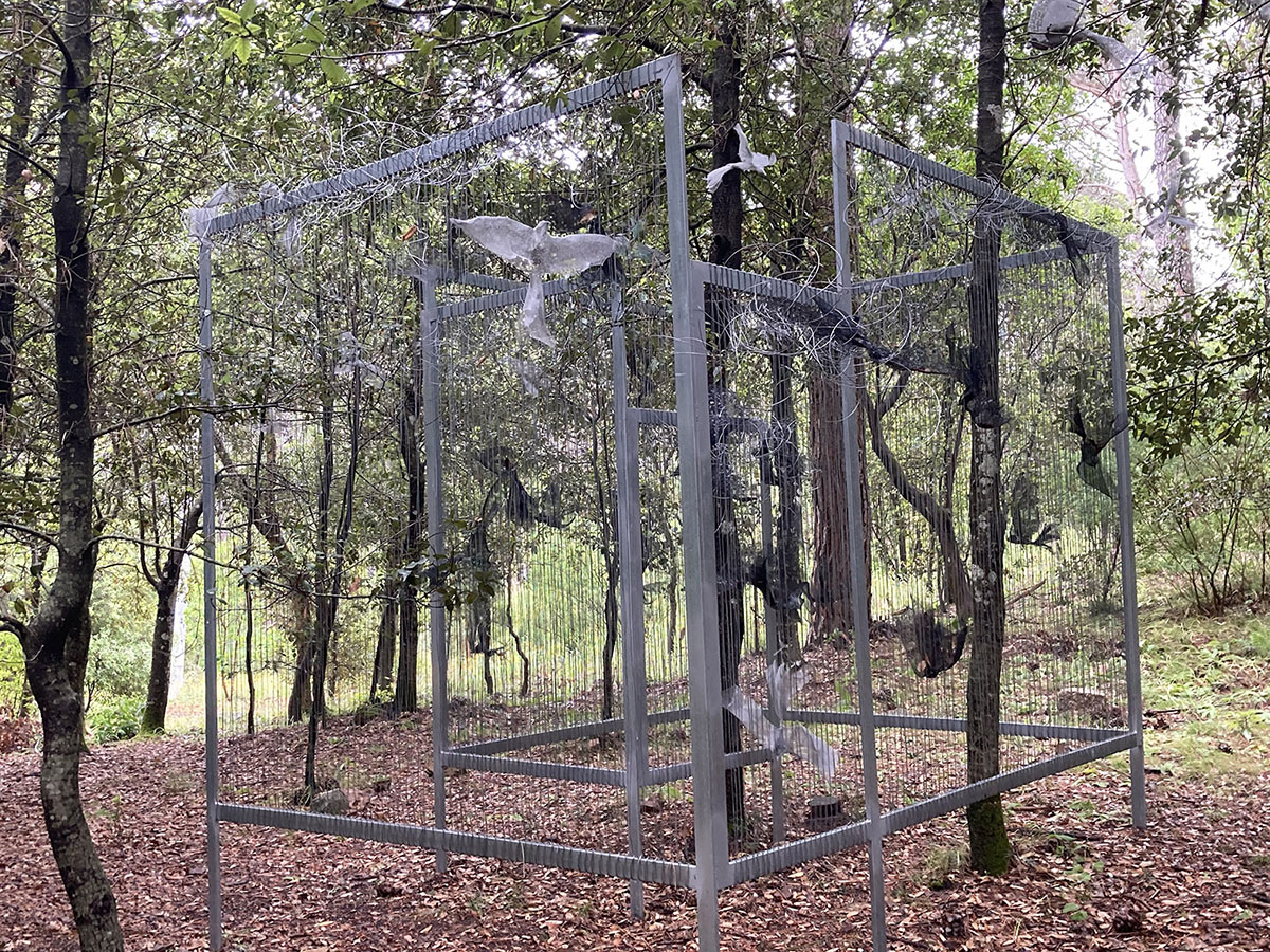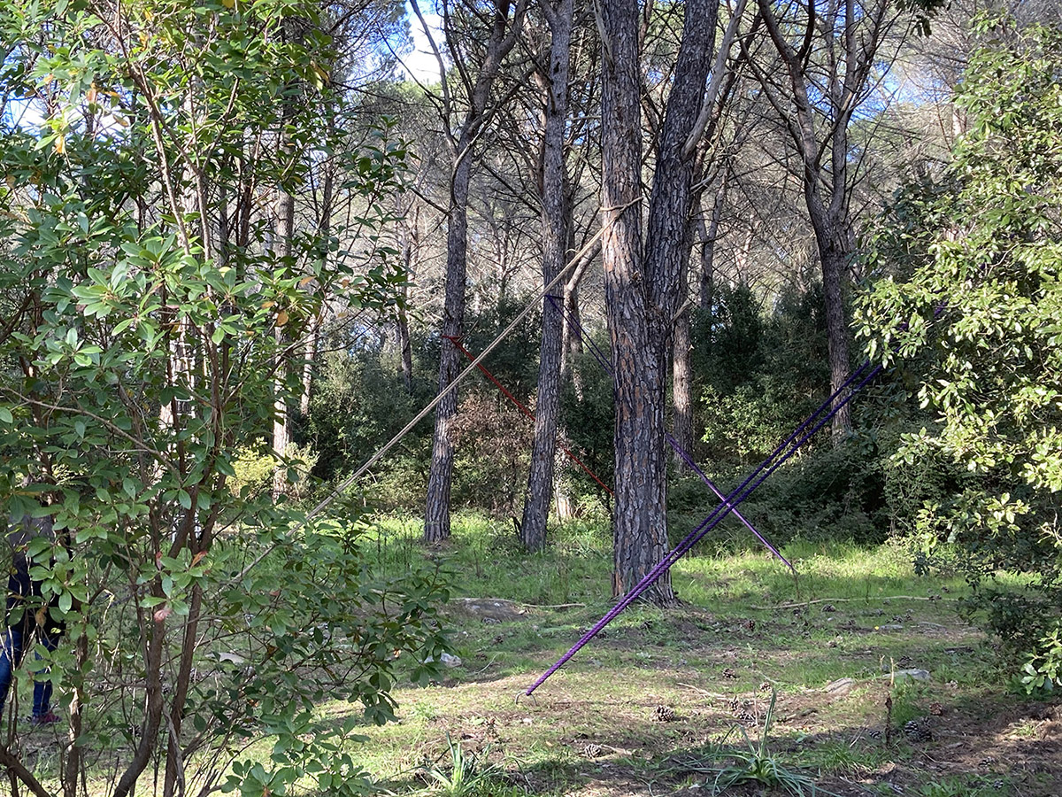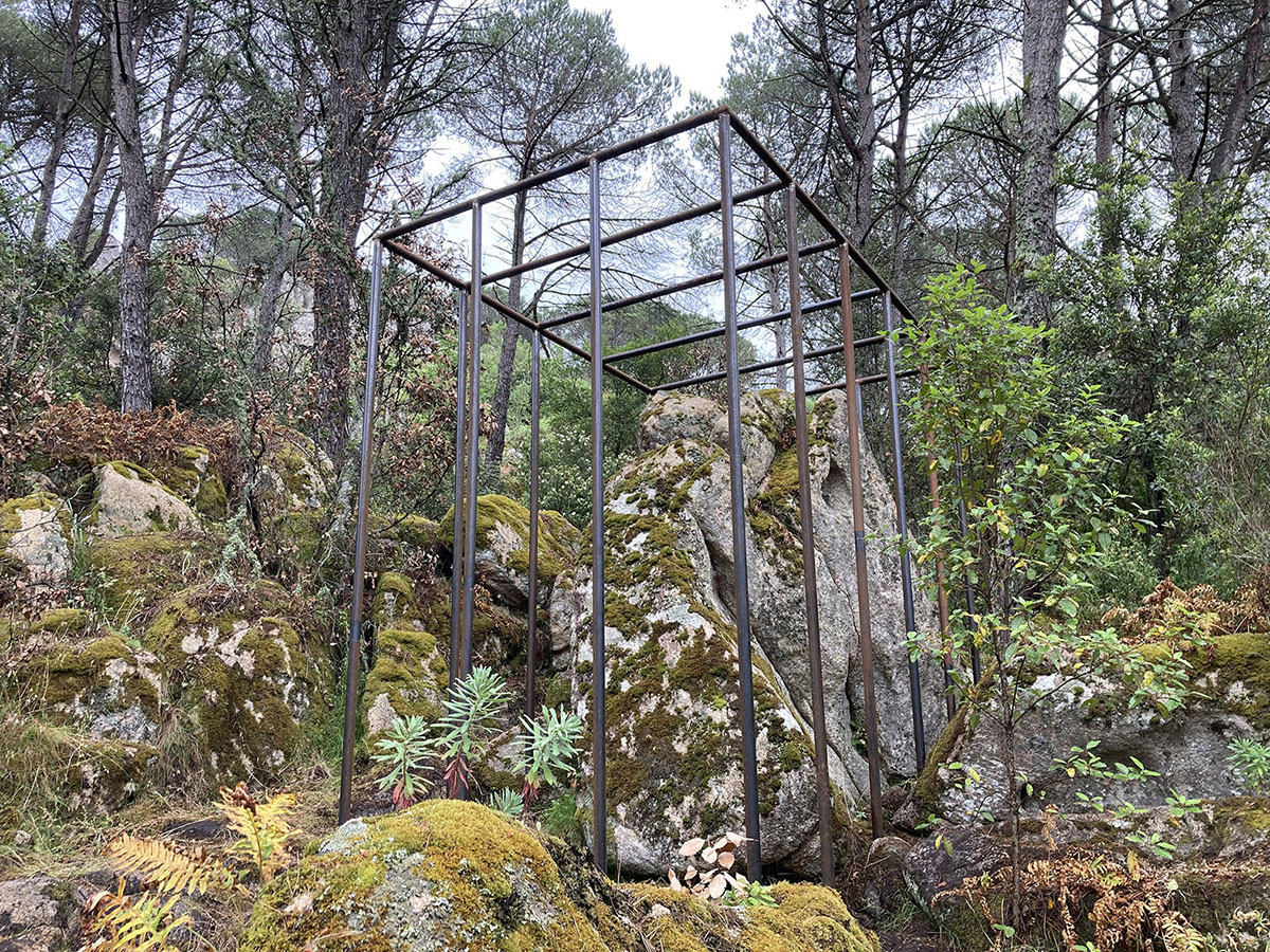 Diversi gli approcci e i media utilizzati dagli artisti invitati dal curatore Giannella Demuro a confrontarsi con la natura incontaminata del Limbara: corde di juta colorate con i colori del mirto e del corbezzolo tese attorno a pini alieni creano monumentali arbremagique con i quali Pietruccia Bassu diffonde i profumi della macchia mediterranea; torrette di avvistamento minimali nascoste tra gli alberi – le Limbara Observatory Towers di Paolo Carta – per osservare il mondo naturale e , di riflesso, anche se stessi; uno spazio naturale modificato dall’intervento umano ritrova l’armonia con l’intervento minimale di Paola Dessy che ricompone volumi e superfici utilizzando levigate inserzioni metalliche; gli Innesti modulari di Daniela Frongia compongono una struttura architettonica dal movimento fluido e morbido sospesa nel vuoto tra graniti e pini svettanti che modifica la percezione del paesaggio e dello spazio circostante; le sedute nomadi Senza titolo (jeans) di Giuseppe Loi, gusci morbidi e accoglienti, sono tracce di vita individuali tra le creste del granito e le piante infestanti di un luogo denso di memorie passate e in attesa di azioni future; otto piccole figure gialle disseminate in ordine sparso nel bosco ma visibili le une alle altre, costituiscono l’opera ironica di Gianni Nieddu: i Pinocchio picchiosono piantati sul terreno, il naso verso l’alto a esplorare il tronco, forse alla ricerca delle proprie origini; Sabrina Oppo ha scelto una piccola radura intima e nascosta per accogliere il suo labirinto personale ordito di fili di metallo, LASCIAR ANDARE, dove trattiene intime e nere emozioni che la forza catartica della natura trasforma in un volo lieve di libertà. É, invece, una vera prigione la gabbia che Bruno Petretto ha costruito attorno ad un monumentale masso di granito, e la Pietra imprigionata è un monito struggente rivolto ad un’umanità troppo spesso incurante della natura che la ospita; anche Josephine Sassu con Non ho Temposi confronta con la natura litica del Limbara, ma dai massi di granito libera con un segno lieve e infantile gli animali fantastici che popolano il suo mondo immaginario. Alla macchia mediterranea si rivolge anche lo sguardo di Monica Solinas con Disseminazioni II, Myrtus che ricrea in grandi forme di metallo, i delicati fiori del mirto quasi un monumento alla fragile bellezza della nostra terra.
