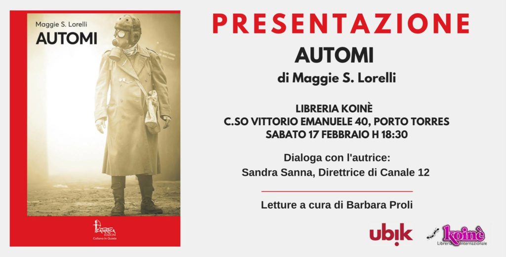 La seconda presentazione di “Automi” si terrà a Porto Torres il giorno sabato 17 febbraio, alle ore 18:30, alla Libreria Koinè, in corso Vittorio Emanuele 40. A dialogare con l’autrice sarà la giornalista Sandra Sanna, direttrice dell’emittente televisiva sassarese “Canale 12”. Le letture saranno a cura di Barbara Proli.
