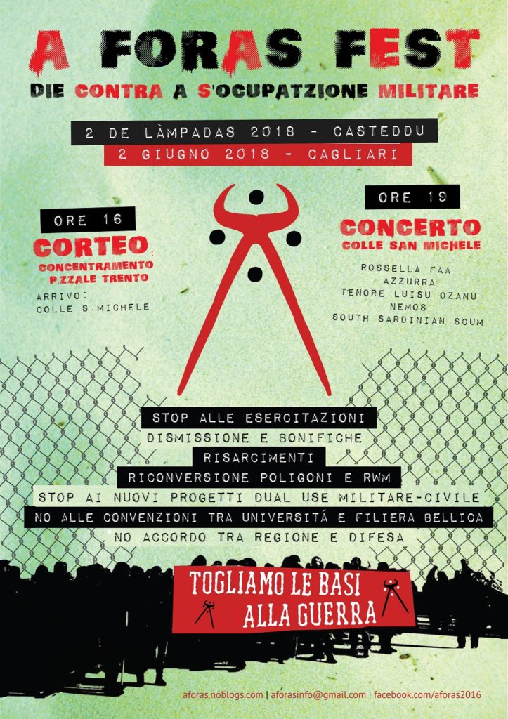 Appuntamento per sabato 2 giugno a Cagliari, con concentramento dalle 16:00 in viale Trento e partenza del corteo che si concluderà al Colle di S. Michele, dove a partire dalle 19:00 inizierà il concerto conclusivo dell’A FORAS FEST – DIE CONTRA A S’OCUPATZIONE MILITARE DE SA SARDIGNA. Al concerto saranno presenti Rossella Faa, Azzurra, Tenore Luisu Ozzanu, Nemo e i South Sardinian Scum.