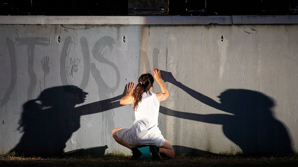 La domanda: “Cosa c’è al di là del muro?” si stempera in un dialogo con il muro stesso, inteso non più come ostacolo ma come condizione strutturale che delimita lo spazio, imponendo ai performer traiettorie che si scontrano con le pareti senza angoscia: sono esplorazioni e tentativi di forzatura, non assalti alla distruzione.