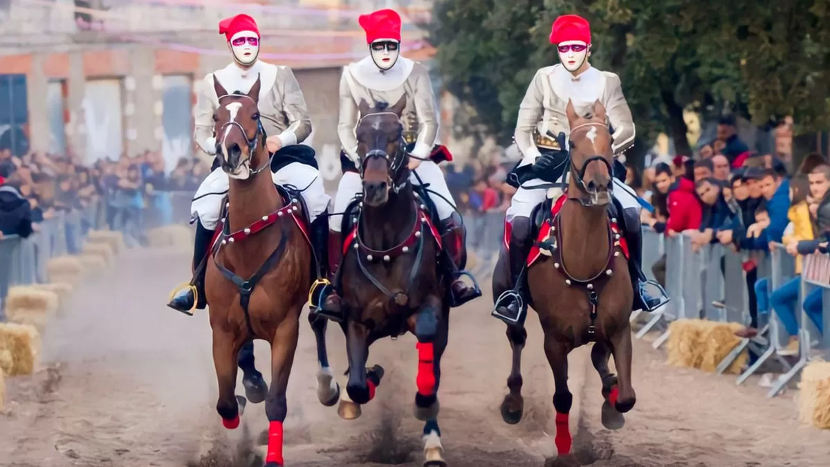 Lungo via Vittorio Emanuele, cuore del paese, si susseguono le emozionanti corse delle pariglie: gruppi di tre cavalieri che, lanciati al galoppo, eseguono acrobazie e figure spettacolari in perfetta sincronia. Maschere, costumi e cavalli decorati contribuiscono a creare un’atmosfera sospesa tra rito e sfida, in cui la tradizione incontra l’energia del movimento.