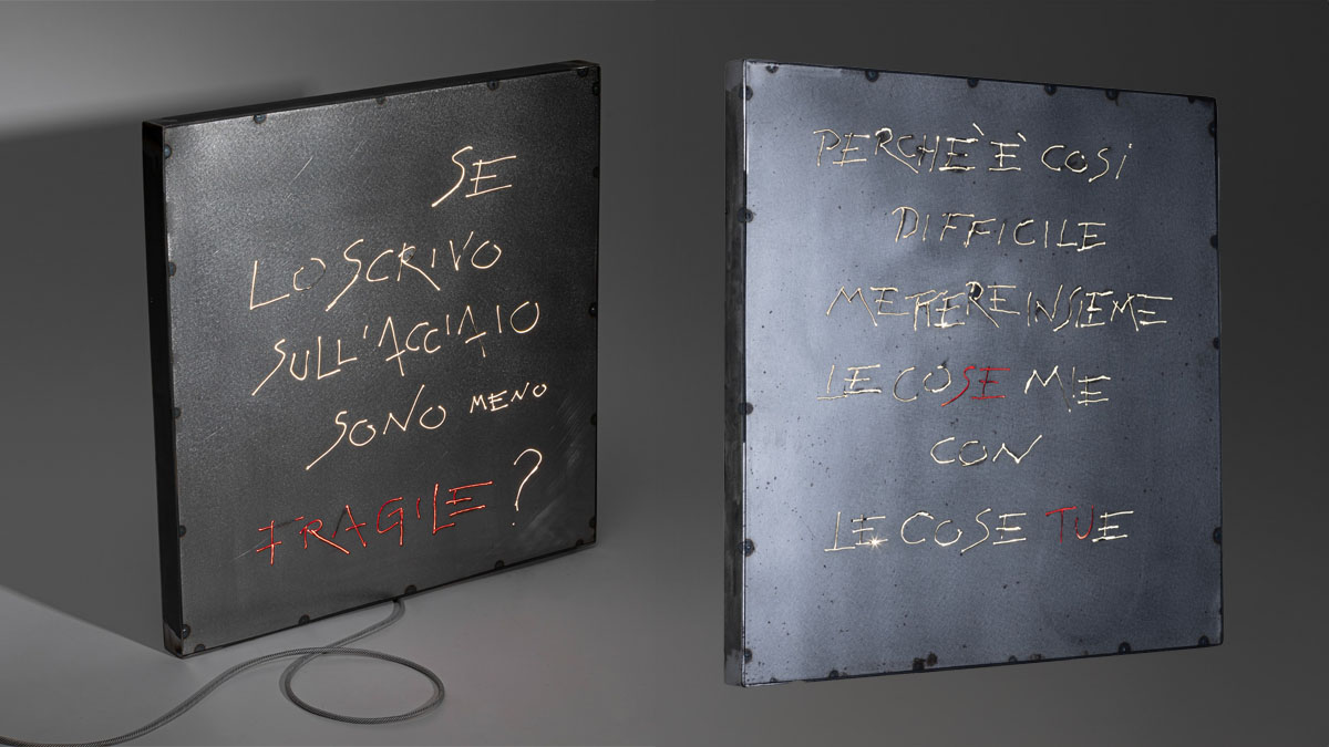 Allontanandosi in questa occasione dal suo mezzo espressivo d’elezione, la fotografia, Marco Ceraglia – che percorre oramai da diversi lustri nuove strade espressive – si permette di sperimentare con materiali e forme tridimensionali che si stagliano nello spazio in tutta la loro fisica evidenza. Nascono così gli elementi dell’installazione “Biografie Minime”, illuminati dall’interno e sulla cui superficie in acciaio sono state incise con un taglio al plasma brevi frasi, domande, riflessioni, che lette in un ordine più o meno casuale si ricompongono in un estemporaneo dialogo interiore, come delle piccole biografie appunto.