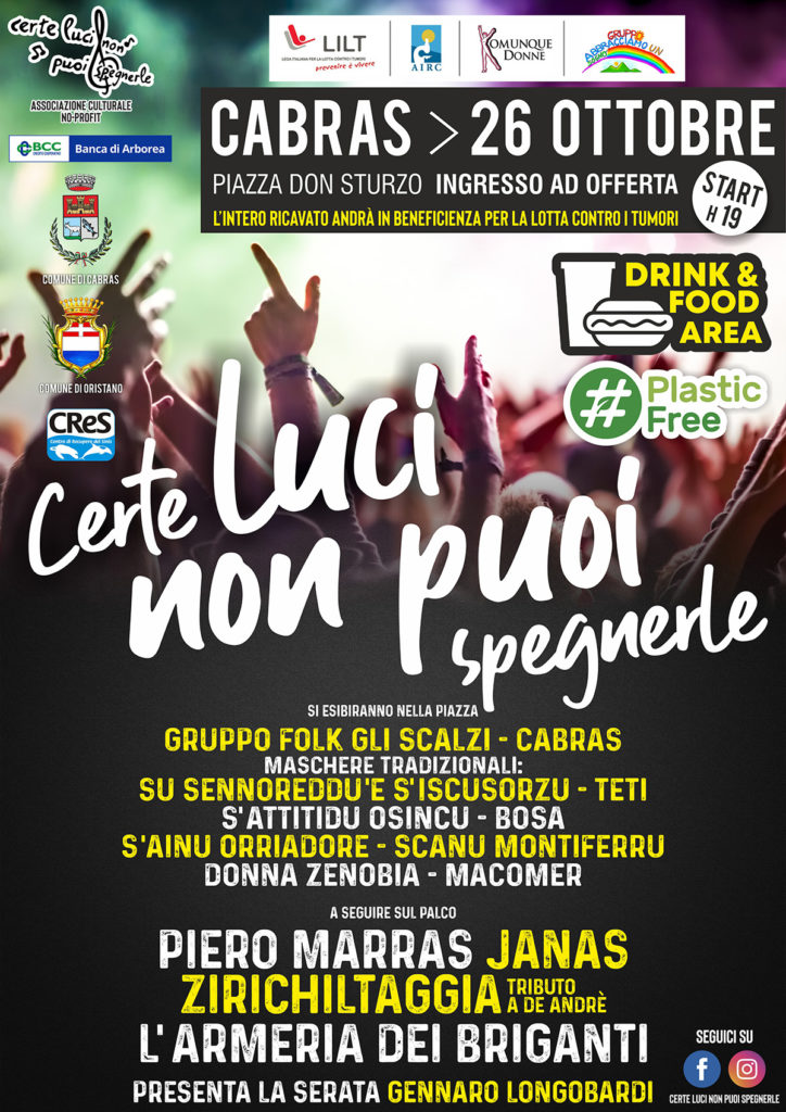 L’associazione culturale no-profit Certe luci non puoi spegnerle nasce nel 2019 per onorare la memoria di Giacomo Meli, un giovane di Cabras mancato prematuramente all’età di 29 anni a causa di un tumore. La voglia di ricordare l’amico scomparso insieme al desiderio di dare un senso al suo sacrificio, hanno dato vita all’associazione e all’evento omonimo. La prima edizione del concerto benefico vuole essere un iniziale contributo alla lotta contro il cancro da parte dei membri del gruppo.
