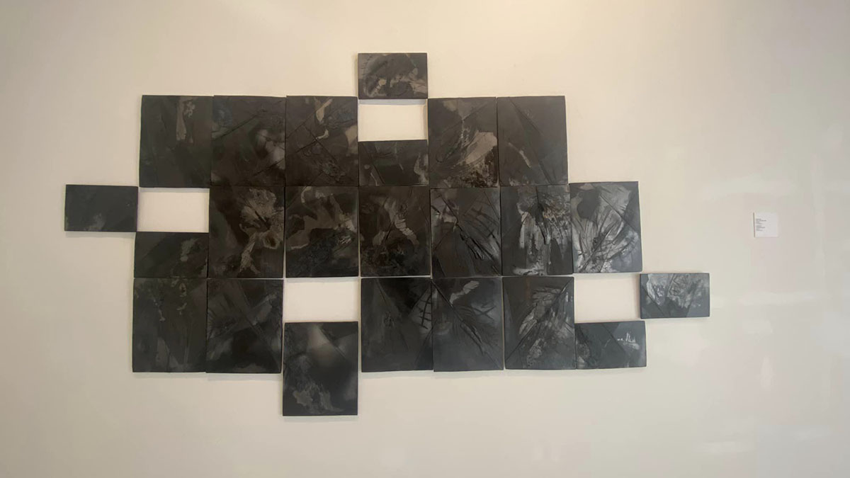 Le lastre in bucchero, materiale molto noto agli Etruschi, cotte senza ossigeno in forni speciali, assumono una particolare tonalità grigio-nera con sfumature argentate. È soprattutto in queste formelle scure che i segni creano un effetto vorticoso di lampi luminescenti e il fondo si trasforma in brillante atmosfera di spazio-luce. Dal gorgo di segni si levano sagome antropomorfe, fondali marini, bestiari fiabeschi, orografie immaginarie, paesaggi osservati dall’alto. Accanto a questi paesaggi universali, modellati dalla secolare erosione del vento e del mare, troviamo parole “in limba” con le quali l’artista riannoda i fili col suo passato, legato ai vecchi mestieri e ai rituali domestici: la lavorazione del pane, i dolci fatti in casa, gli insaccati stesi ad asciugare. Ricordi che trovano nell’argilla modelli eterni che traggono linfa dal radicamento e dai segni del divenire storico.