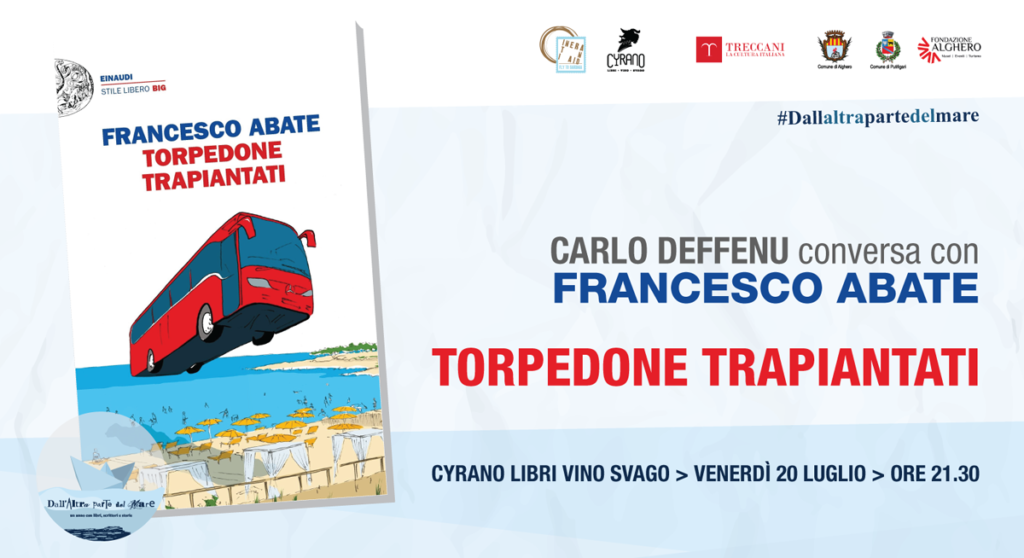 Venerdì 20 luglio il libro del Torpedone Trapiantati farà una fermata ad Alghero per una delle anteprime del festival Dall’altra parte del mare. A partire dalle 21,30, nello spazio all’aperto della Libreria Cyrano, Francesco Frisco Abate, accompagnato da Carlo Deffenu racconterà al pubblico le disavventure del suo nuovo romanzo, “Torpedone Trapiantati”.