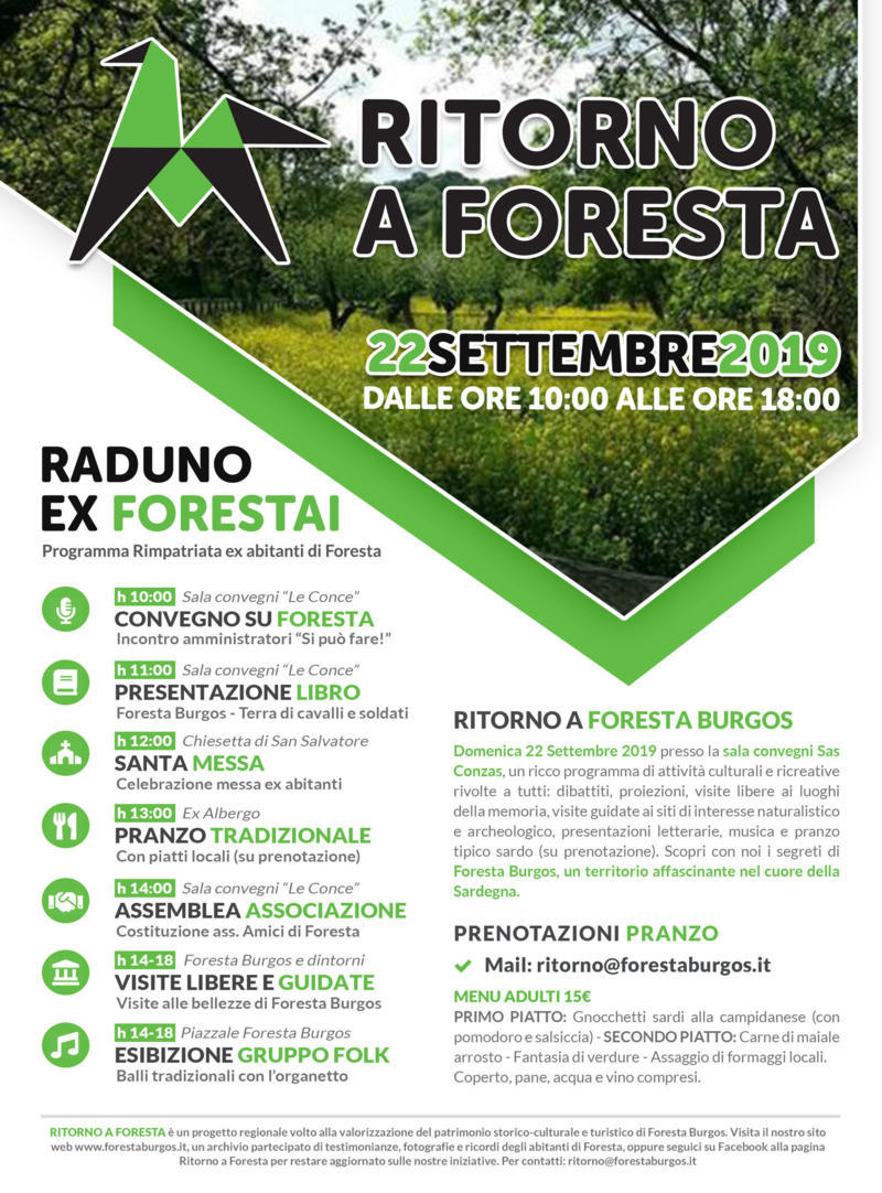 Domenica 22 settembre Foresta Burgos sarà animata dalla manifestazione “Ritorno a Foresta”. A dar vita, almeno per un giorno, al suggestivo villaggio ora in completo abbandono sarà il raduno degli ex dipendenti del “Centro Rifornimento Quadrupedi per l’Esercito” e degli ex dipendenti dell’E.T.F.A.S. e della Regione Sardegna che negli anni Cinquanta prima e nei sessanta poi hanno dovuto lasciare a malincuore Foresta, il luogo della loro gioventù.