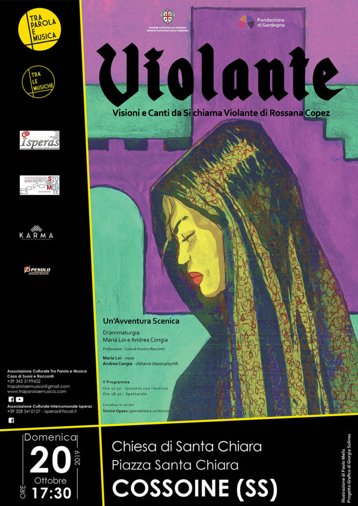 Seguirà Violante, l’opera musico-teatrale tratta dal romanzo, firmata nel 2018 dalla Casa di Suoni e Racconti. Il lavoro artistico mette in scena le Visioni e gli Incubi di Violante Carroz, la feudataria vissuta nel XIV Secolo e giunta in Sardegna per difendere e governare i possedimenti della sua famiglia. Circondata da spettri e fantasmi del passato, la Contessa di Quirra sarà da essi condotta alla scoperta della storia del suo casato. L’attrice Maria Loi (voce) e il chitarrista Andrea Congia (chitarra classica/synth) daranno vita con Parola, Musica e Canti al Racconto di Rossana Copez.
