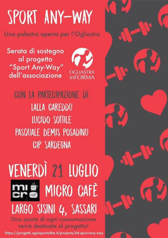 Quella di venerdì sarà una serata di solidarietà a favore dell’Associazione Ogliastra InForma, che a Lanusei sta realizzando il progetto Sport Any-way: una palestra in cui ragazze e ragazzi con disabilità cognitive e relazionali possano fare sport in sicurezza e libertà. L’obiettivo da raggiungere, per realizzare materialmente il progetto, è raccogliere 15mila euro. Una volta tagliato il traguardo, la Fondazione Vodafone aggiungerà 10mila euro alla somma raccolta, arrivando ad una cifra che consentirà di coprire tutte le spese di realizzazione del progetto.