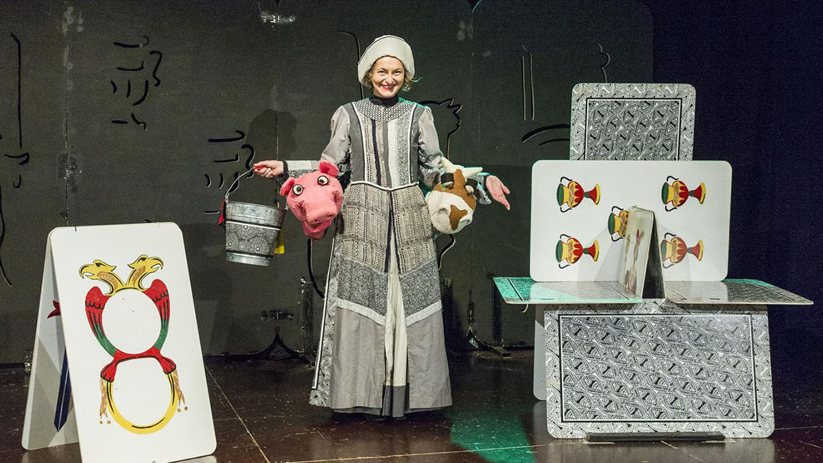 In scena un grosso mazzo di carte da gioco che prende vita, si monta e si smonta, proprio come i castelli di carte. In questo mondo si muovono i personaggi di Cenerentola. Un alternarsi folle e scanzonato di risate, magie, musiche ed emozioni. E Cenerentola? Ma certo, c’è anche lei, accompagnata dai suoi inseparabili amici: il maiale Geremia sempre tormentato dall’idea di mettersi a dieta e la vacca Gertrude che continuamente si lagna dei suoi veri o presunti malanni. E poi c’è la fatina.